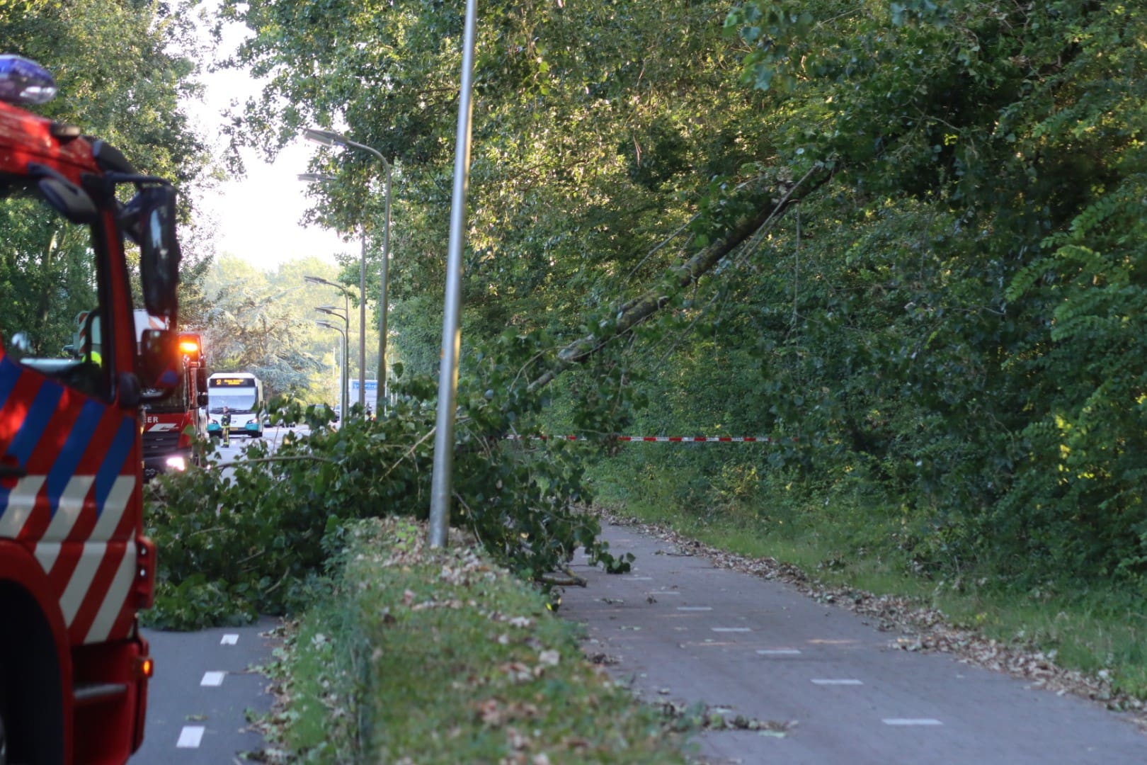 De brandweer kwam met twee wagens ter plaatse en zette de weg aan beide kanten af. Omdat het gekraak duidelijk te horen was, vond de brandweer het een gevaarlijke situatie. Tijdens het verwijderen van de obstakels waren grote losse takken nog hangend zichtbaar in de bomen. Deze moesten met de ladderwagen worden weggehaald.