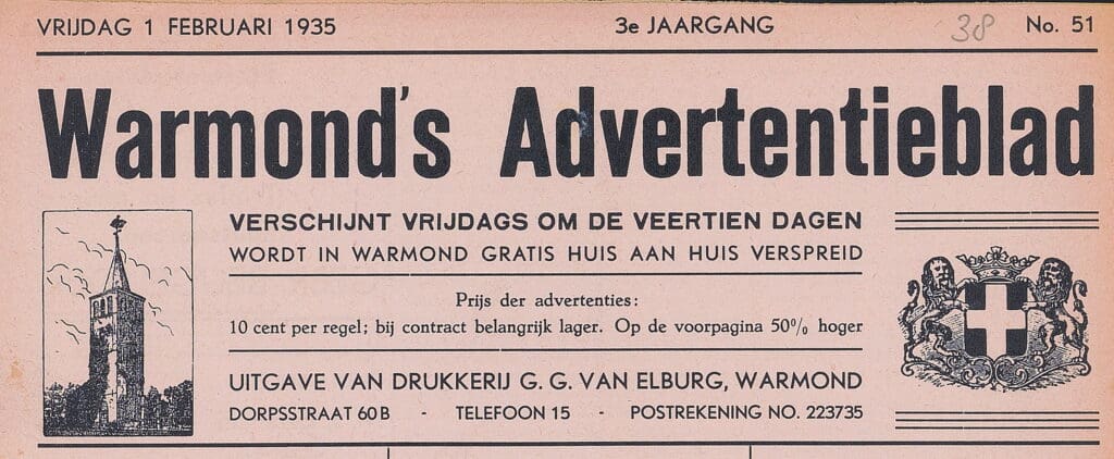 Warmond– Het Historisch Genootschap Warmelda heeft een serie Warmondse advertentiebladen uit de jaren 1932 tot en met 1940 gedigitaliseerd. In die jaren verscheen het Warmonds Advertentieblad elke veertien dagen. Het was een uitgave van Drukkerij G.G. van Elburg, gevestigd aan de Dorpsstraat in Warmond.