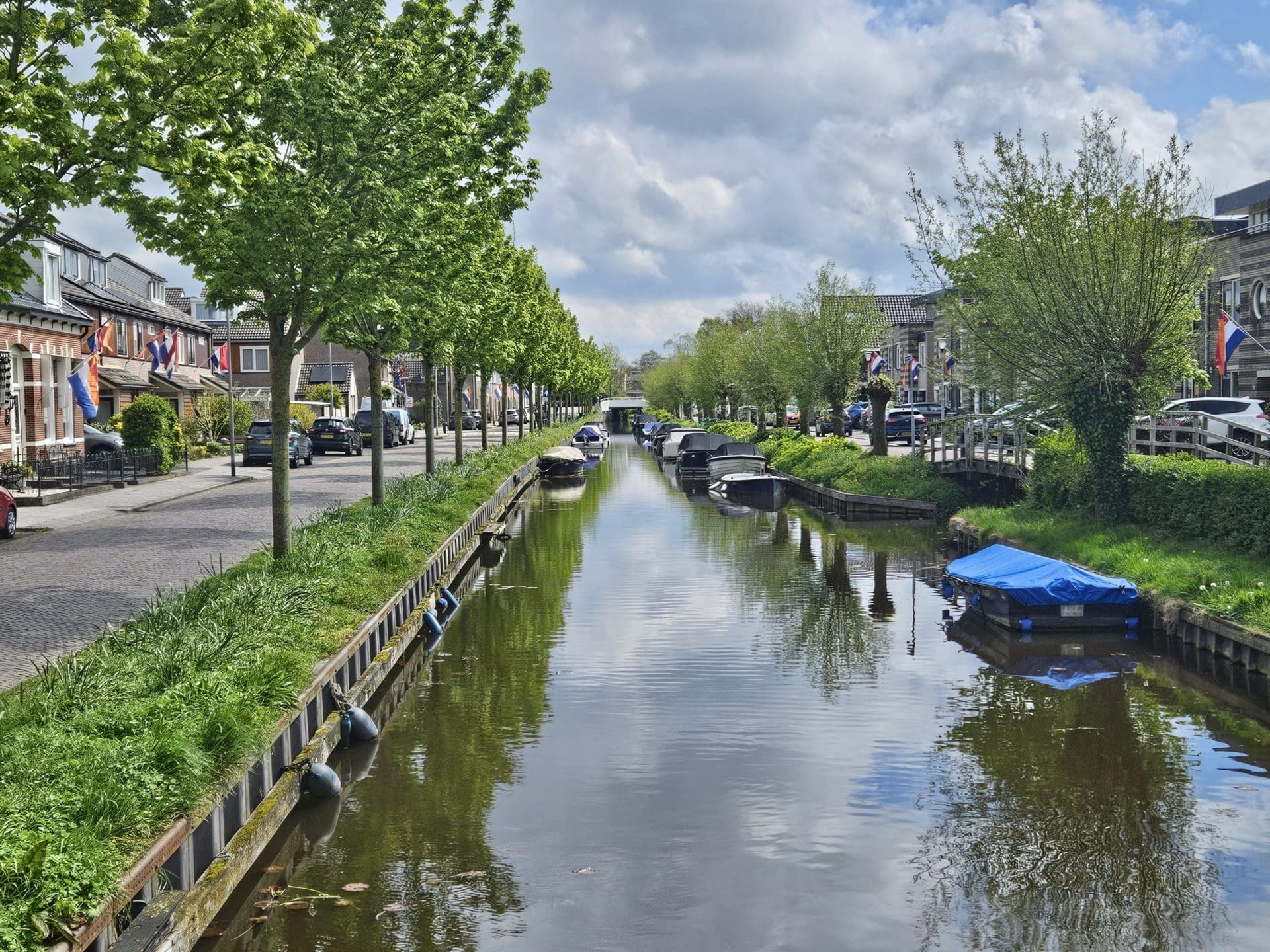 Bekijk hieronder een foto van de rood-wit-blauw-oranje gekleurde kade in Sassenheim:
