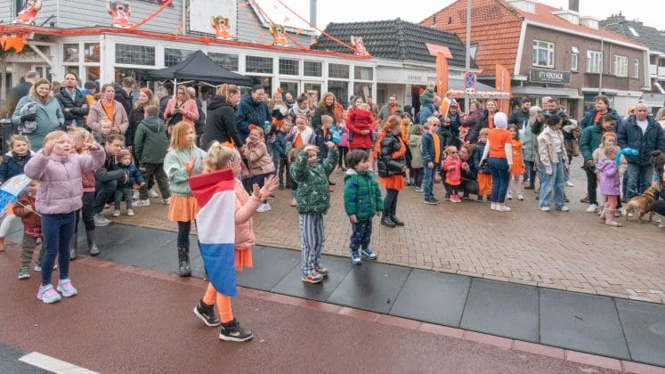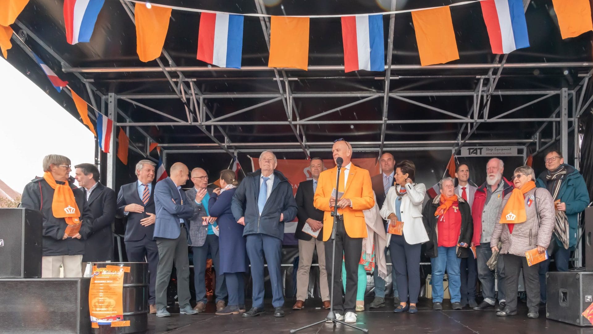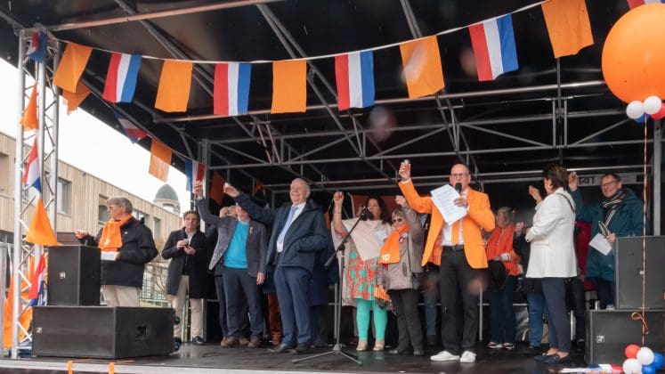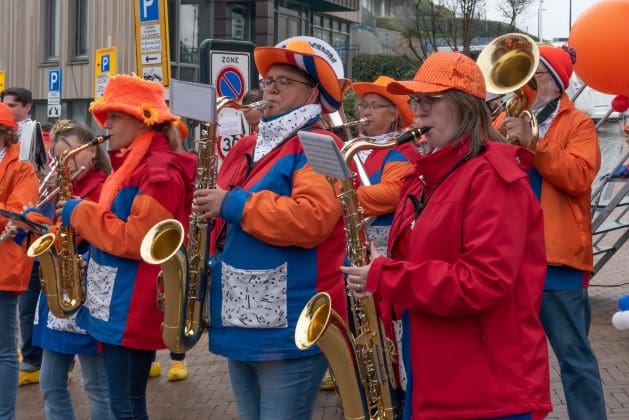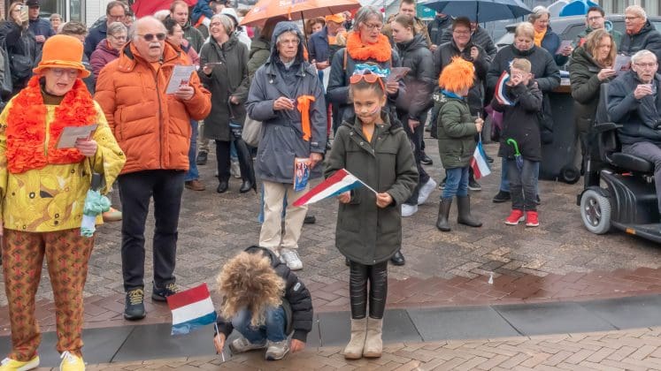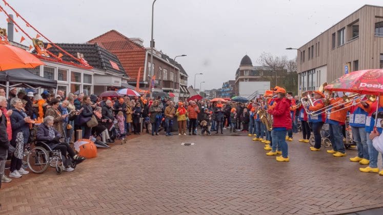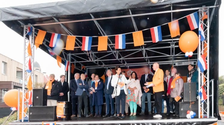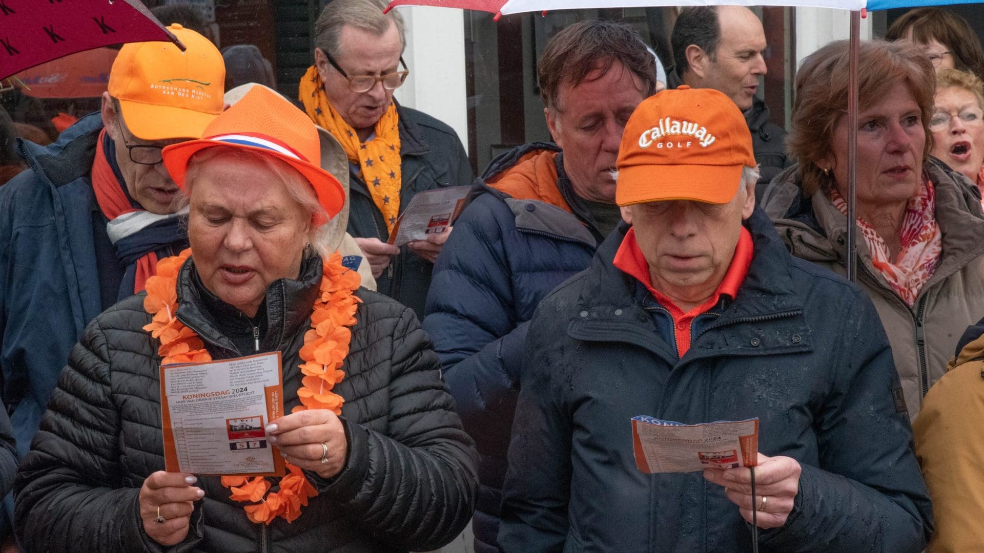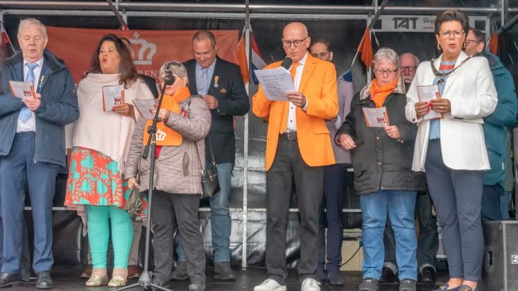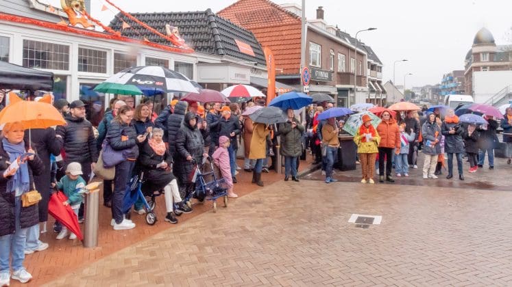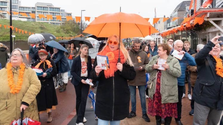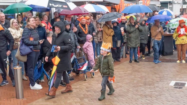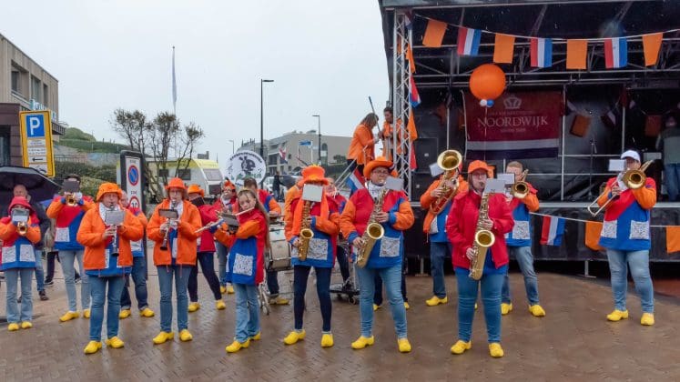 Noordwijk: Het verjaardagsfeest van de Koning begint helaas met donkere, grijze wolken in Noordwijk. De regen weerhoudt de Noordwijkers er echter niet van om er een feestje van te maken. Gewapend met oranje paraplu’s en regenjassen komen tientallen oranjegekleurde feestvierders naar de Grent voor de jaarlijkse aubade, die wordt ingeleid door een speech van de burgemeester Wendy Verkleij. De wethouders en gedecoreerden zijn ook aanwezig op het podium.