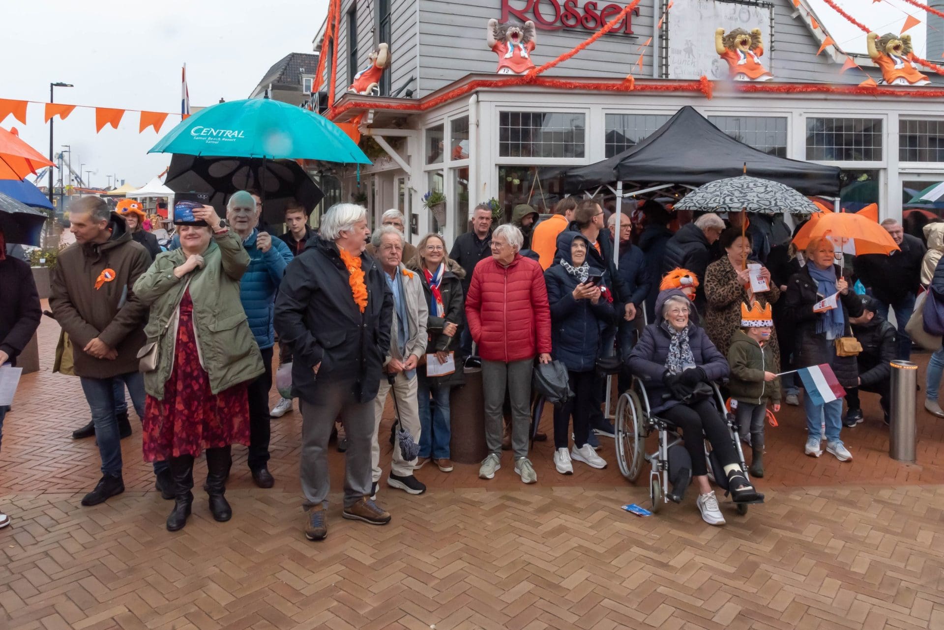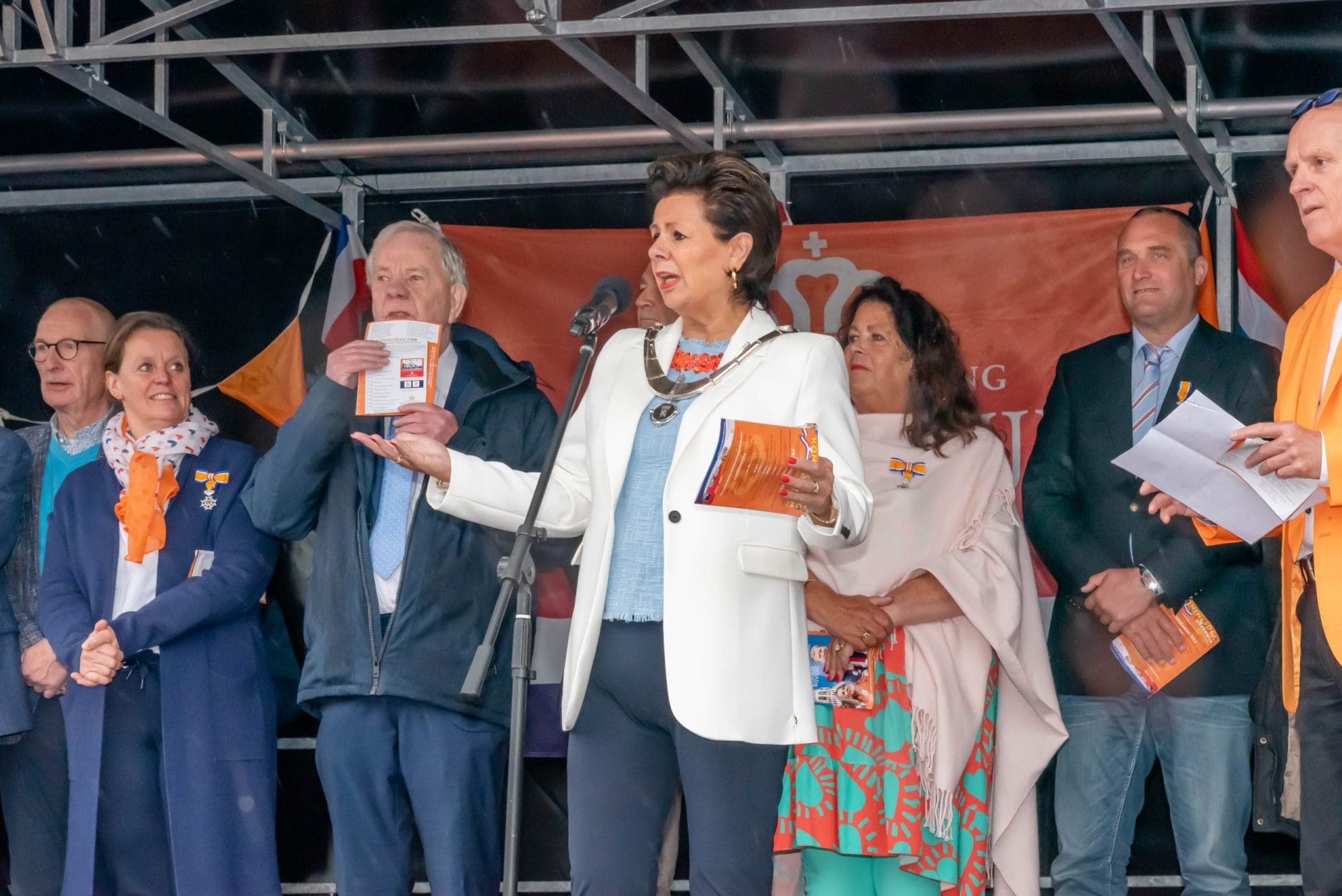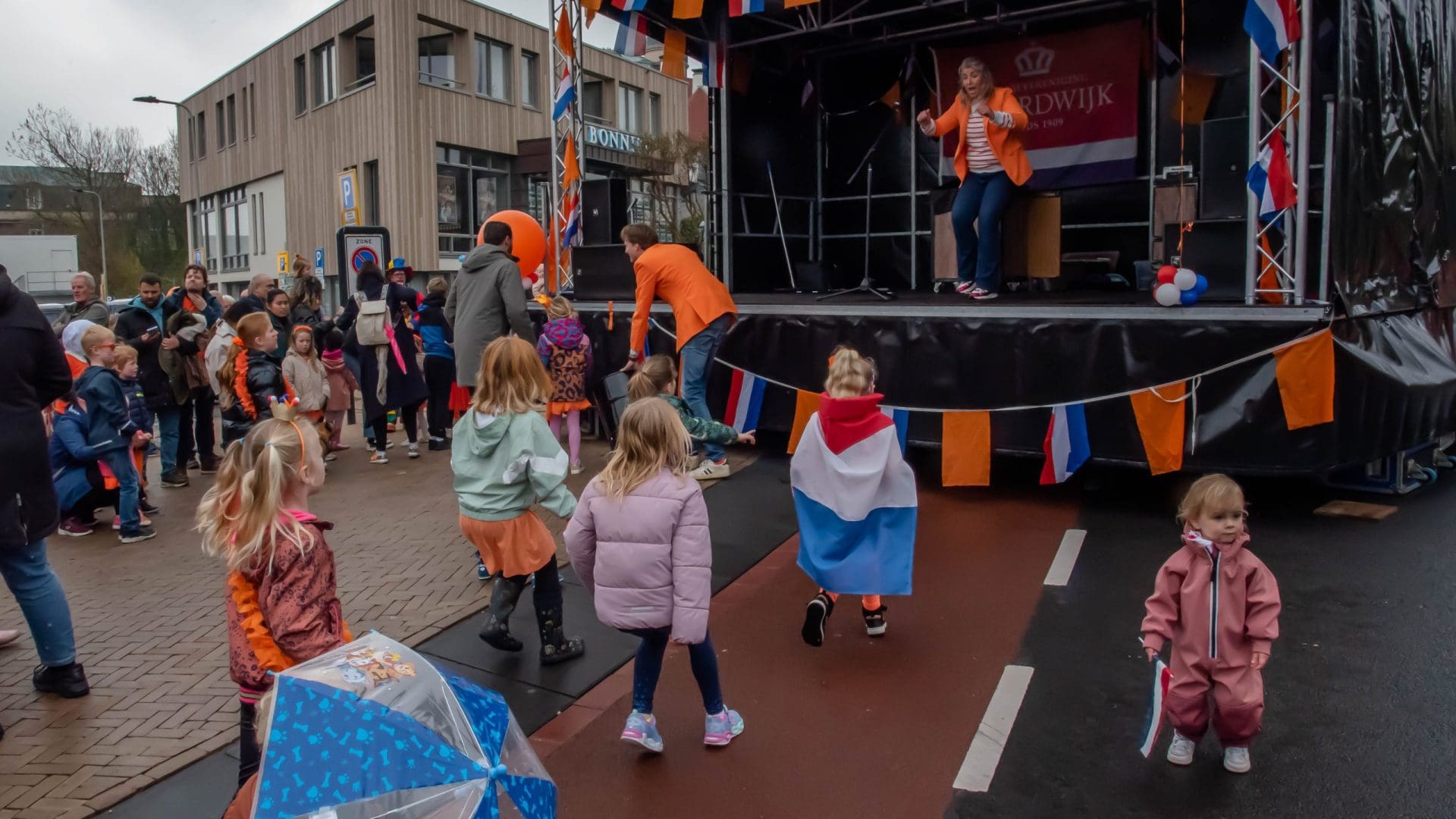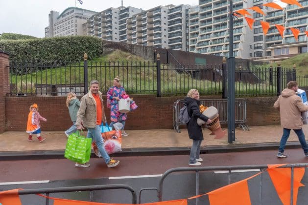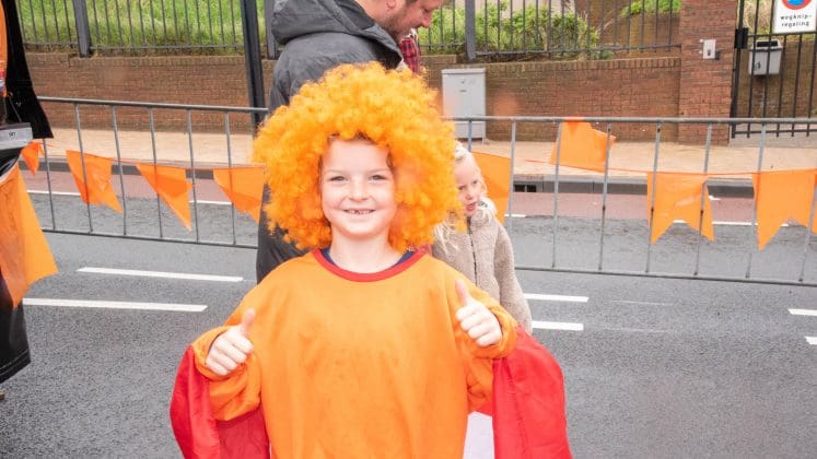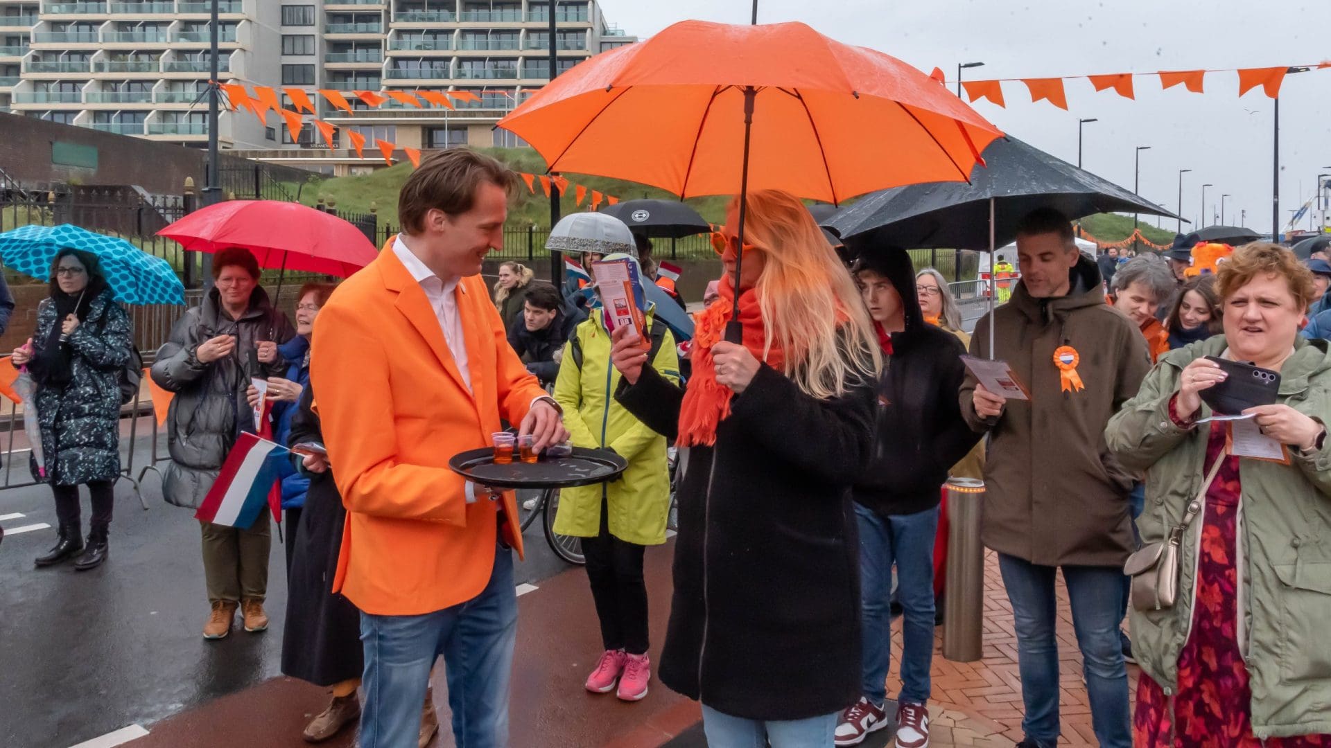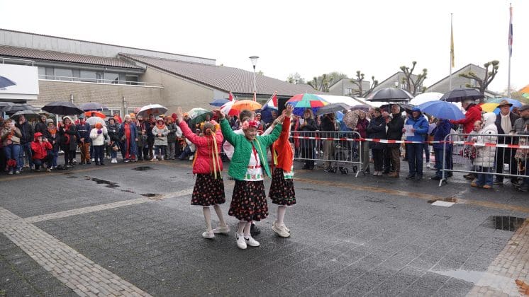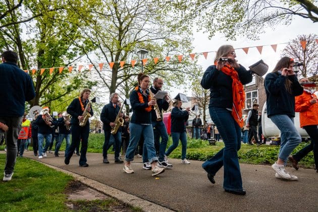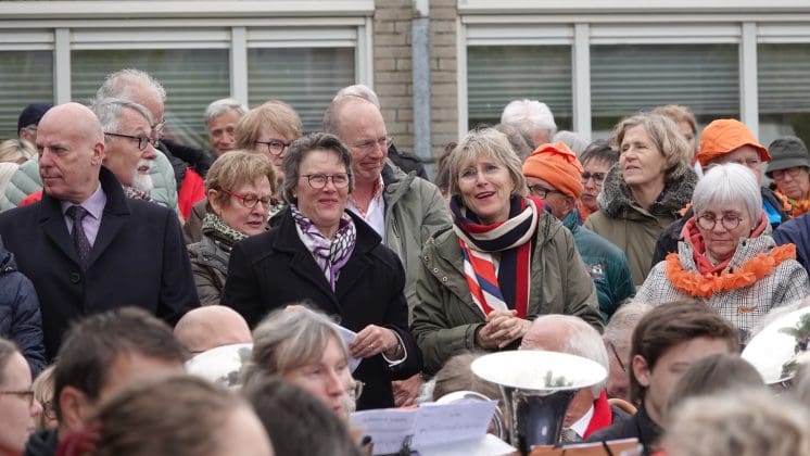 Noordwijk: Het verjaardagsfeest van de Koning begint helaas met donkere, grijze wolken in Noordwijk. De regen weerhoudt de Noordwijkers er echter niet van om er een feestje van te maken. Gewapend met oranje paraplu’s en regenjassen komen tientallen oranjegekleurde feestvierders naar de Grent voor de jaarlijkse aubade, die wordt ingeleid door een speech van de burgemeester Wendy Verkleij. De wethouders en gedecoreerden zijn ook aanwezig op het podium.