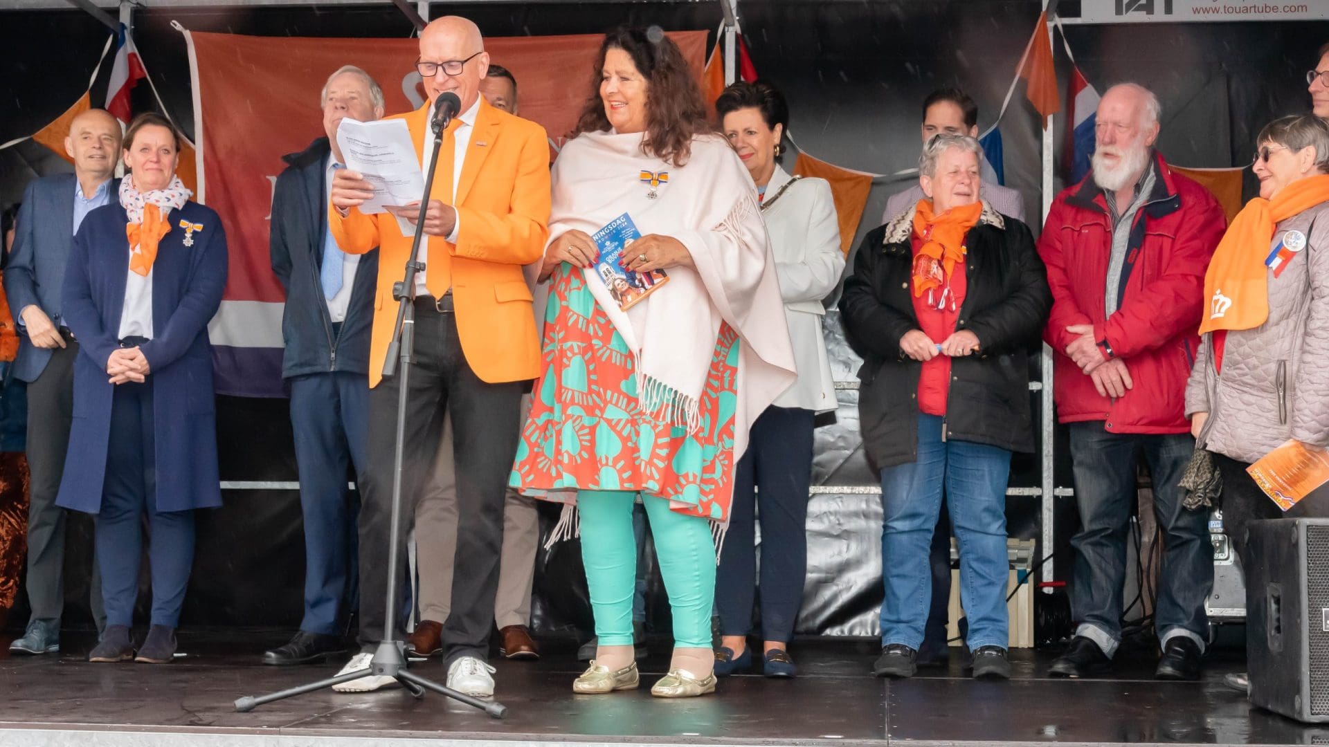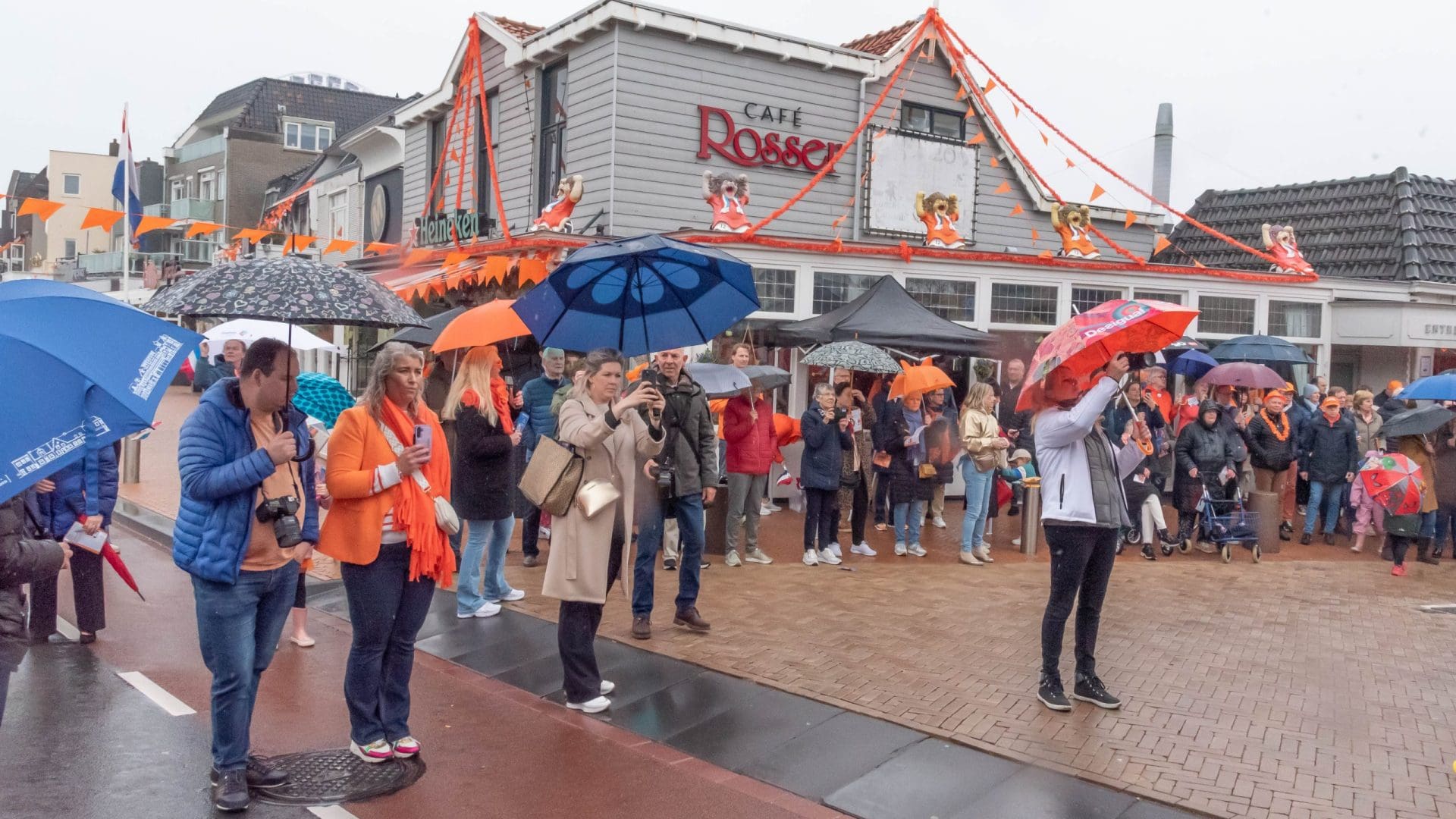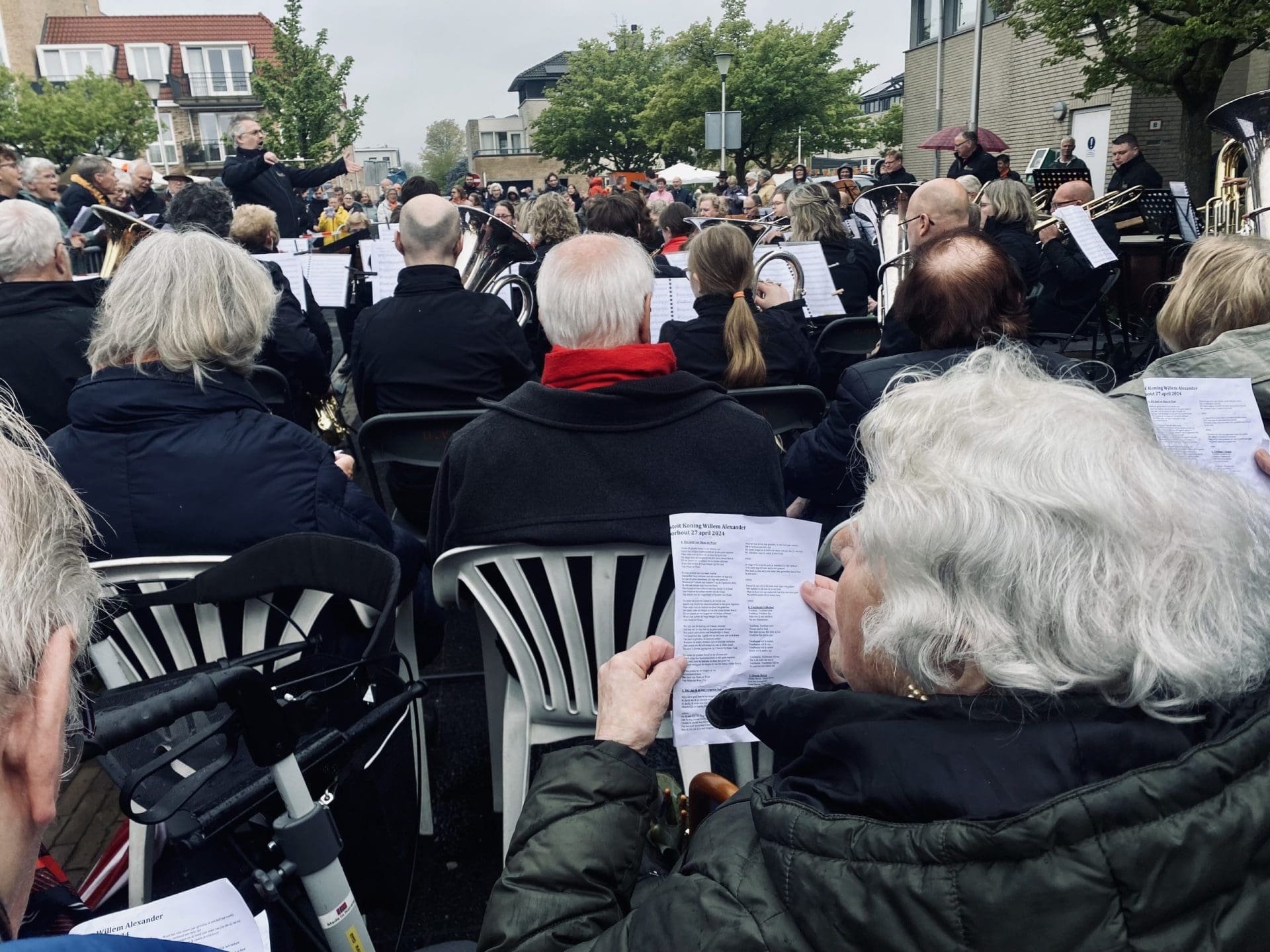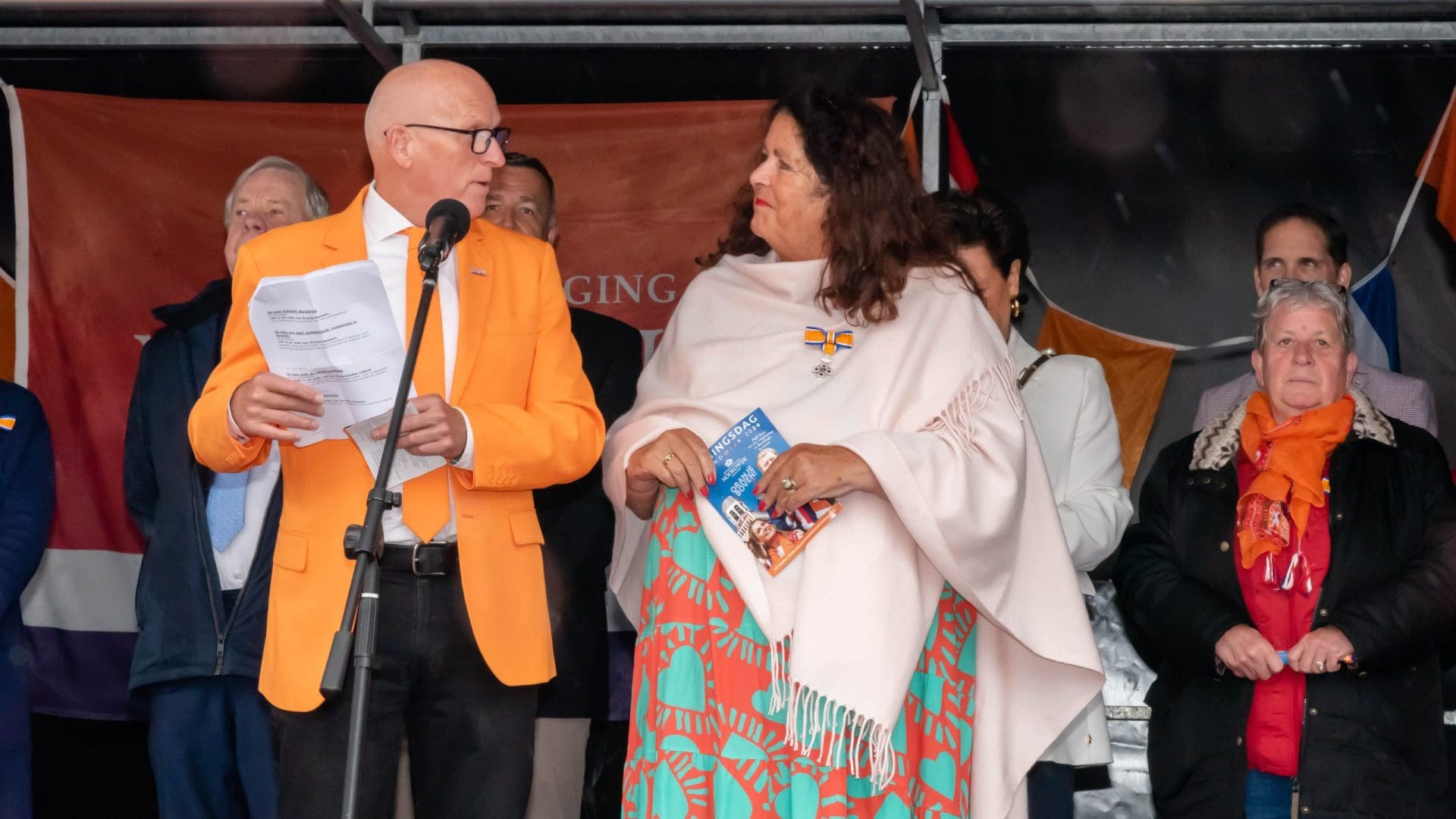 Noordwijk: Het verjaardagsfeest van de Koning begint helaas met donkere, grijze wolken in Noordwijk. De regen weerhoudt de Noordwijkers er echter niet van om er een feestje van te maken. Gewapend met oranje paraplu’s en regenjassen komen tientallen oranjegekleurde feestvierders naar de Grent voor de jaarlijkse aubade, die wordt ingeleid door een speech van de burgemeester Wendy Verkleij. De wethouders en gedecoreerden zijn ook aanwezig op het podium.