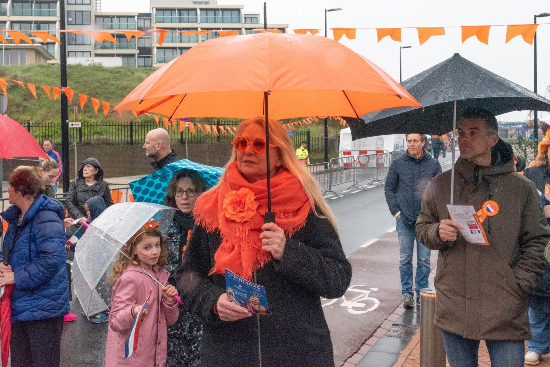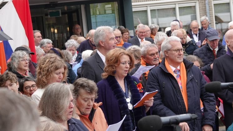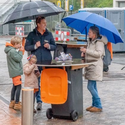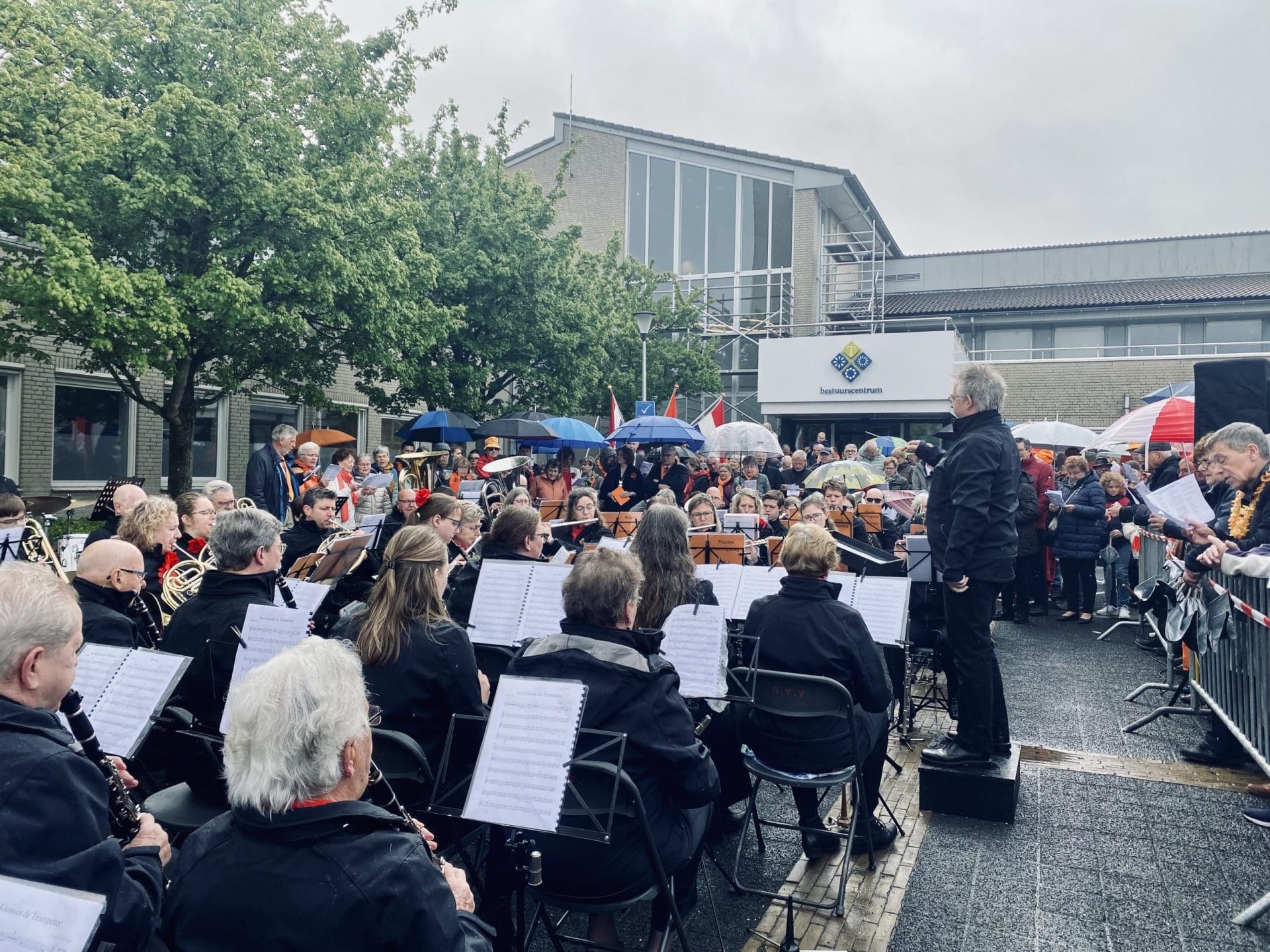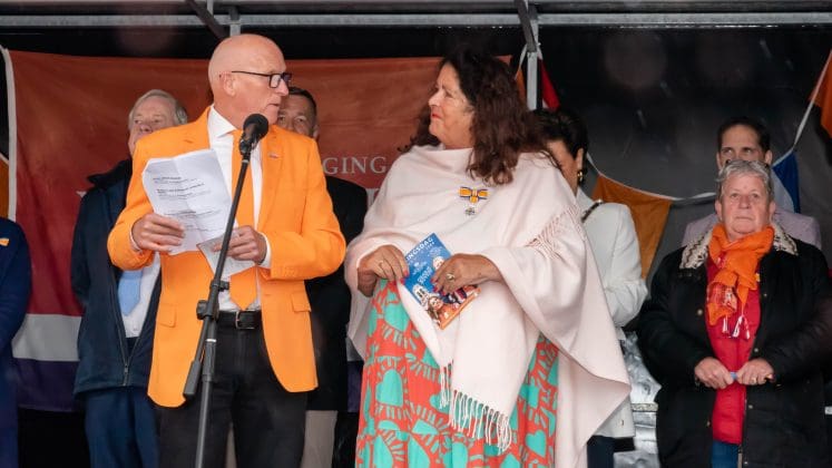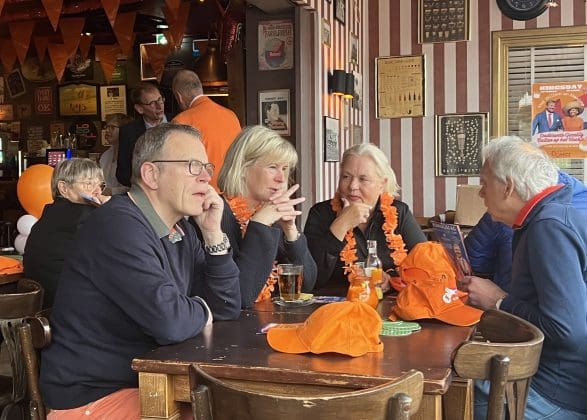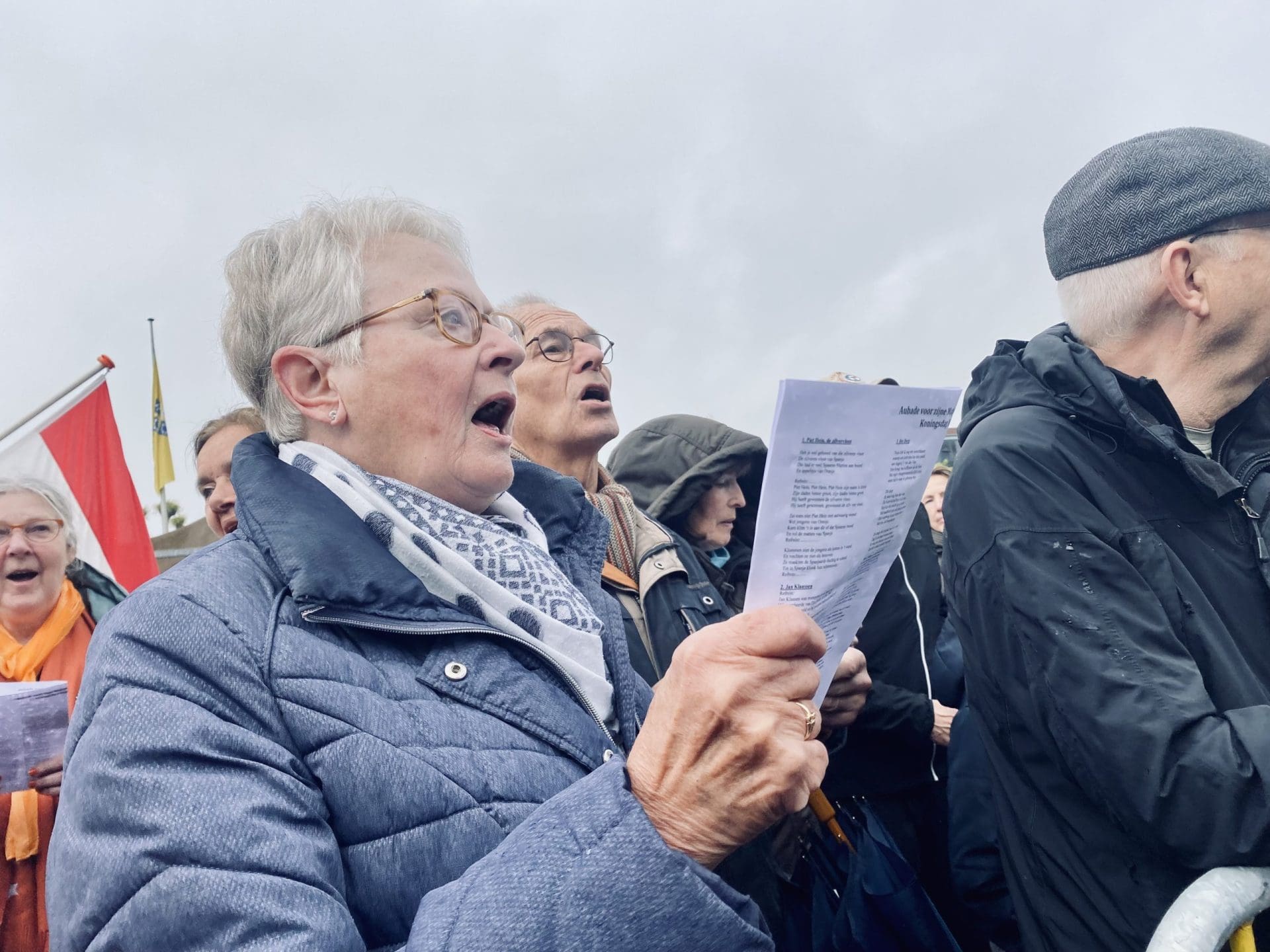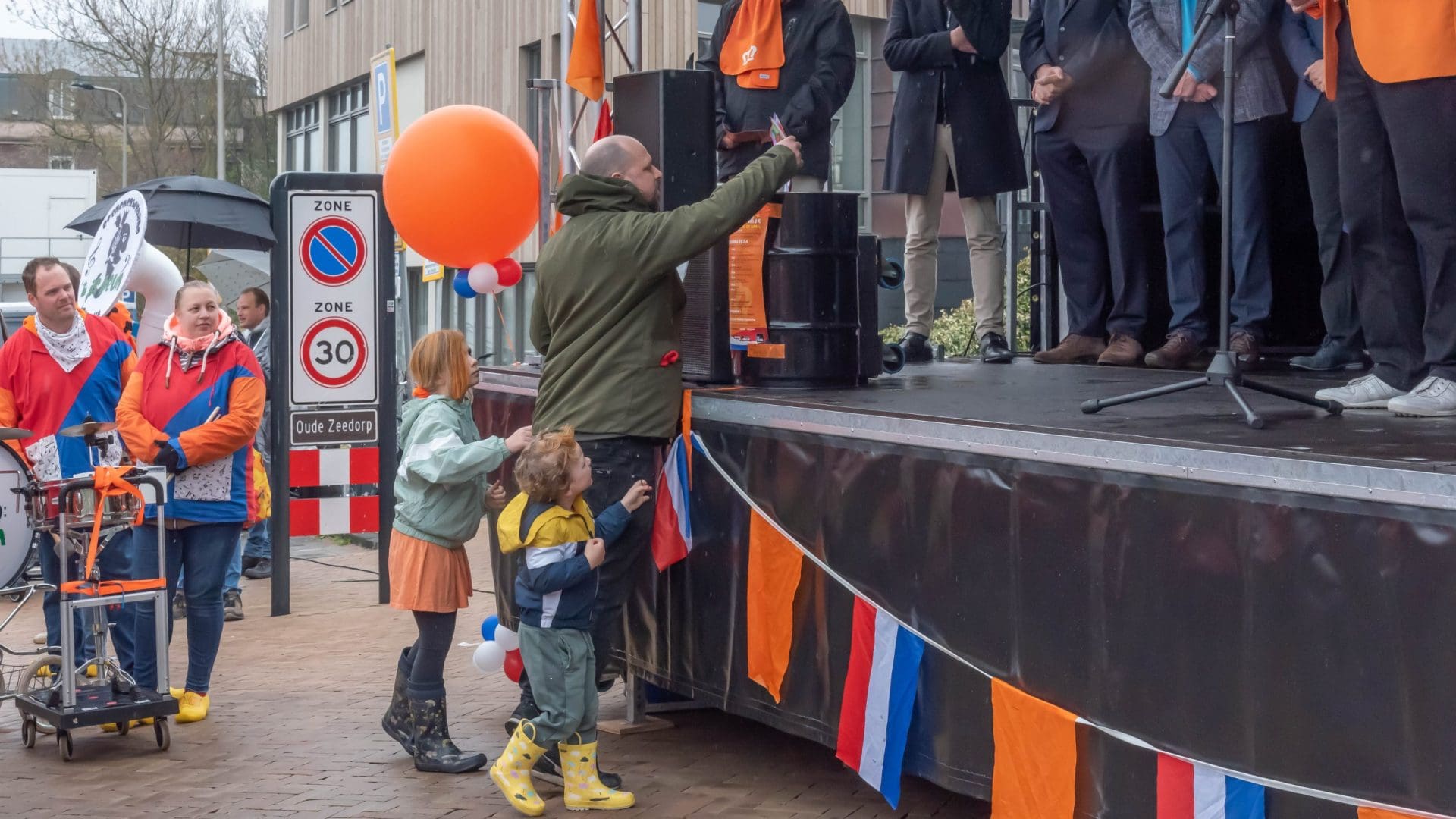 Noordwijk: Het verjaardagsfeest van de Koning begint helaas met donkere, grijze wolken in Noordwijk. De regen weerhoudt de Noordwijkers er echter niet van om er een feestje van te maken. Gewapend met oranje paraplu’s en regenjassen komen tientallen oranjegekleurde feestvierders naar de Grent voor de jaarlijkse aubade, die wordt ingeleid door een speech van de burgemeester Wendy Verkleij. De wethouders en gedecoreerden zijn ook aanwezig op het podium.
