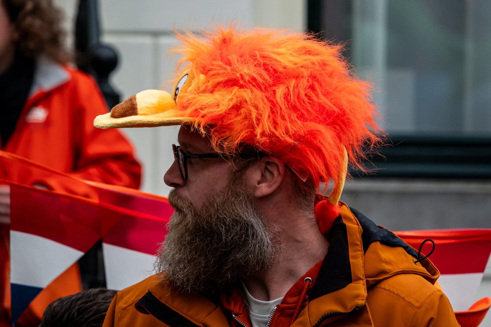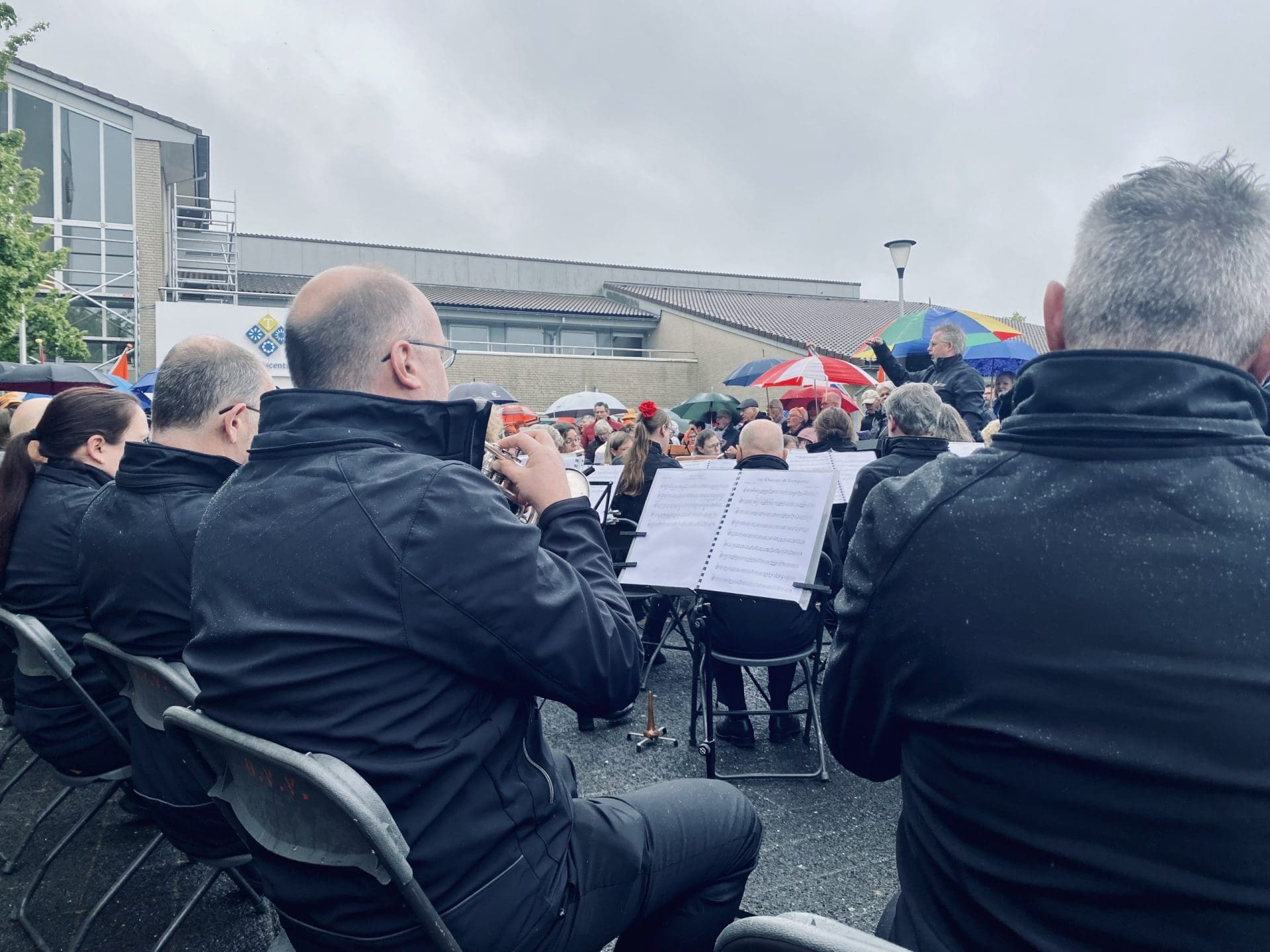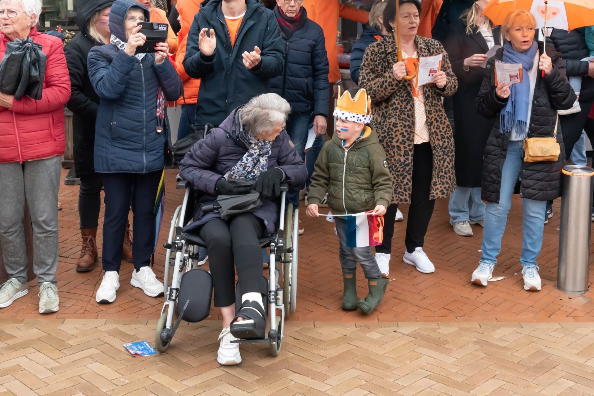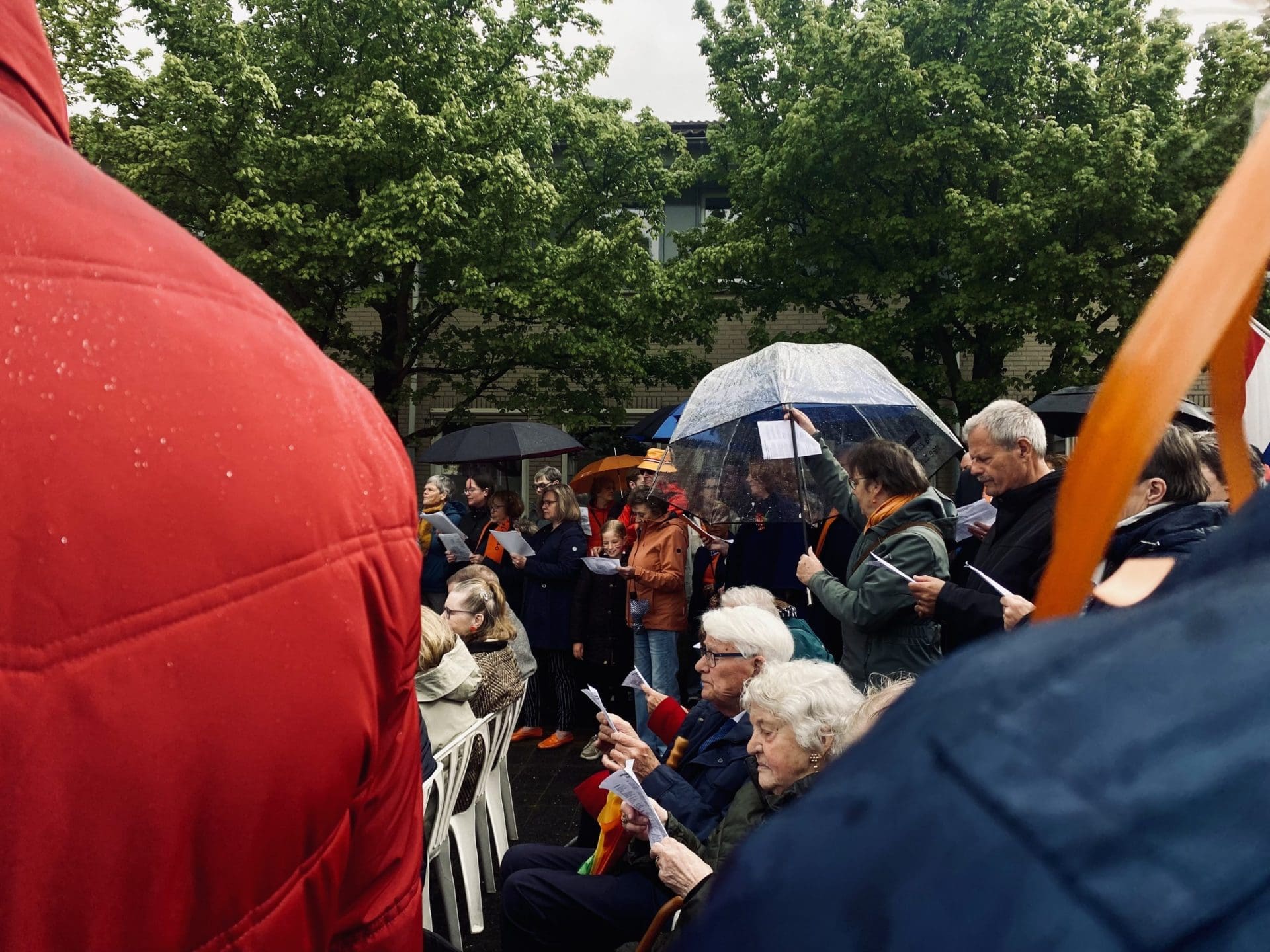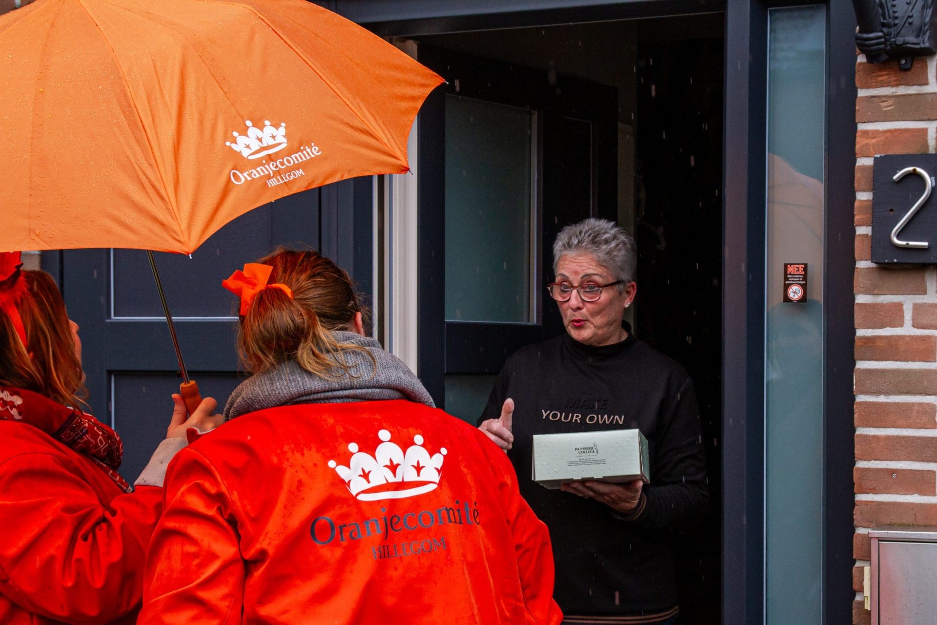 Noordwijk: Het verjaardagsfeest van de Koning begint helaas met donkere, grijze wolken in Noordwijk. De regen weerhoudt de Noordwijkers er echter niet van om er een feestje van te maken. Gewapend met oranje paraplu’s en regenjassen komen tientallen oranjegekleurde feestvierders naar de Grent voor de jaarlijkse aubade, die wordt ingeleid door een speech van de burgemeester Wendy Verkleij. De wethouders en gedecoreerden zijn ook aanwezig op het podium.