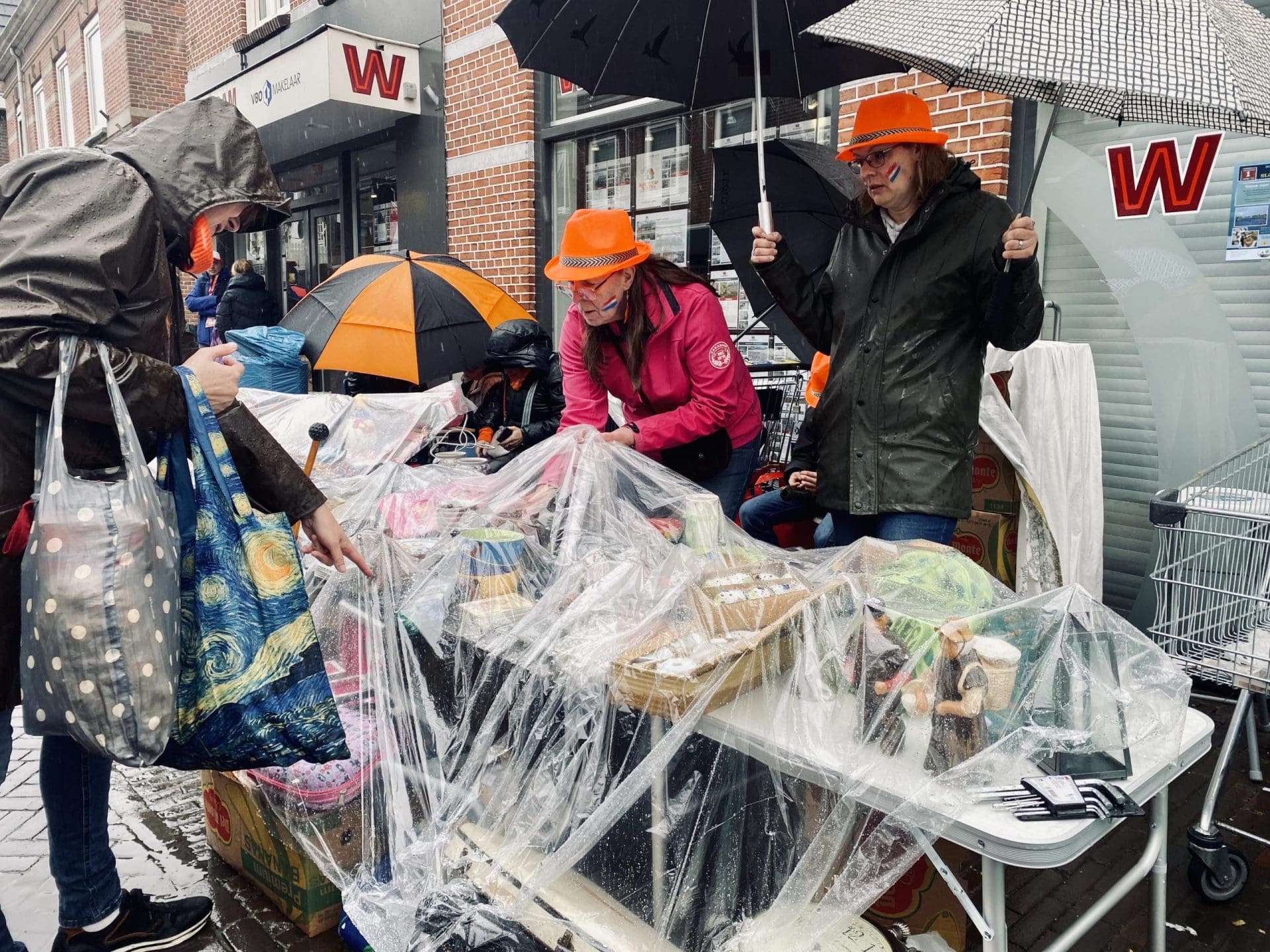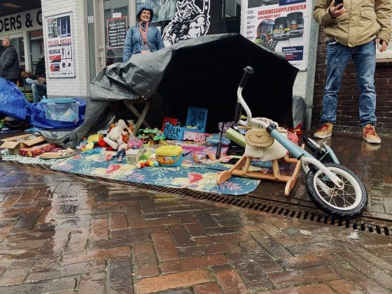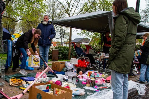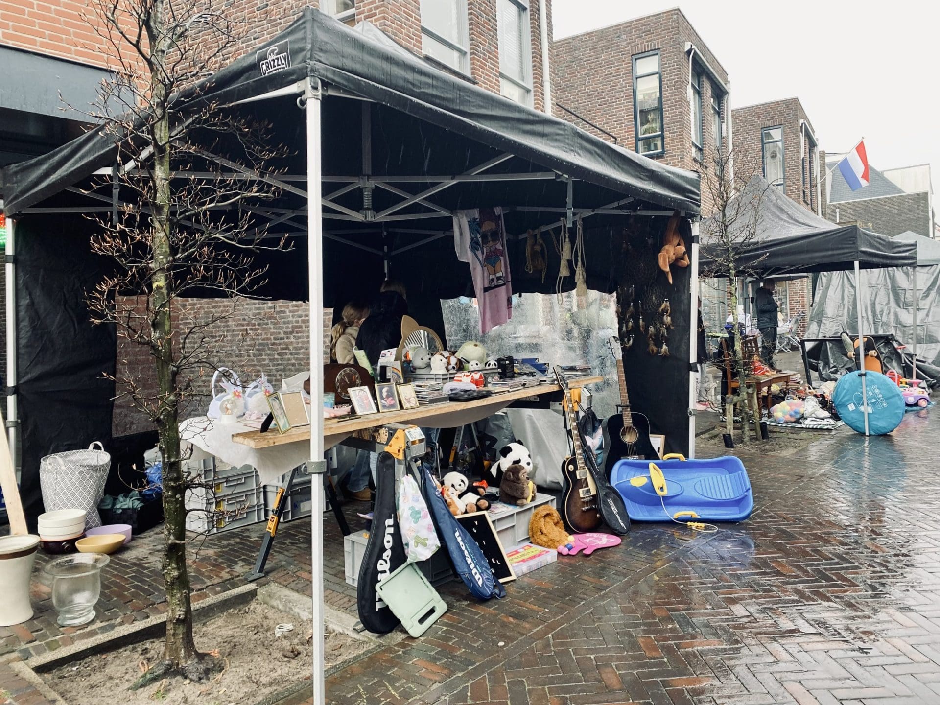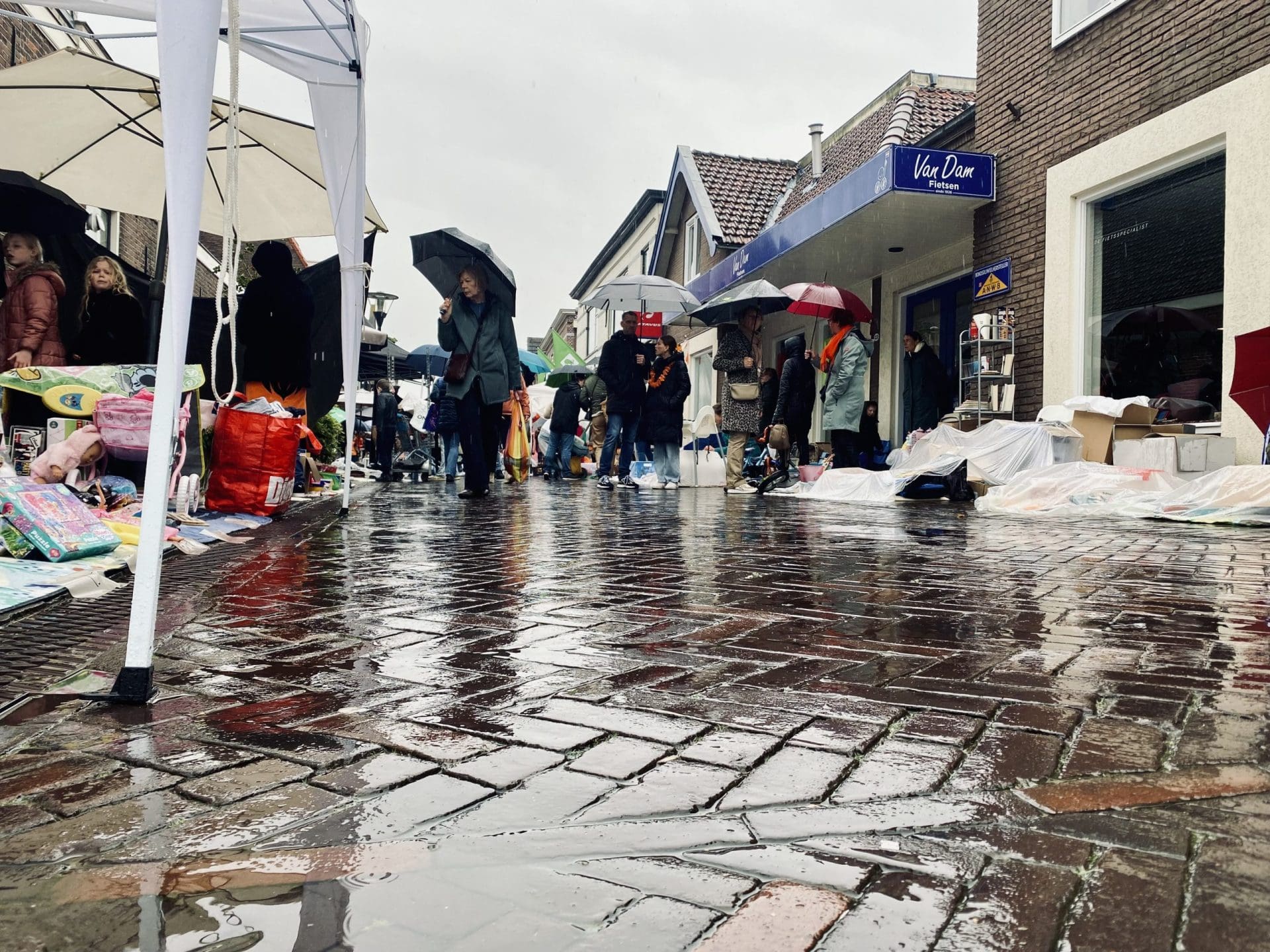 Noordwijkerhout: Ook in Noordwijkerhout is het een natte boel. De normaal drukbezochte rommelmarkt lijkt, letterlijk, in het water te vallen. Toch staan de straten rond de Witte Kerk vol met voortvarende verkopers om hun oude spullen aan de man te brengen. Met geïmproviseerde oplossingen zorgen dat de producten zo goed als droog blijven.