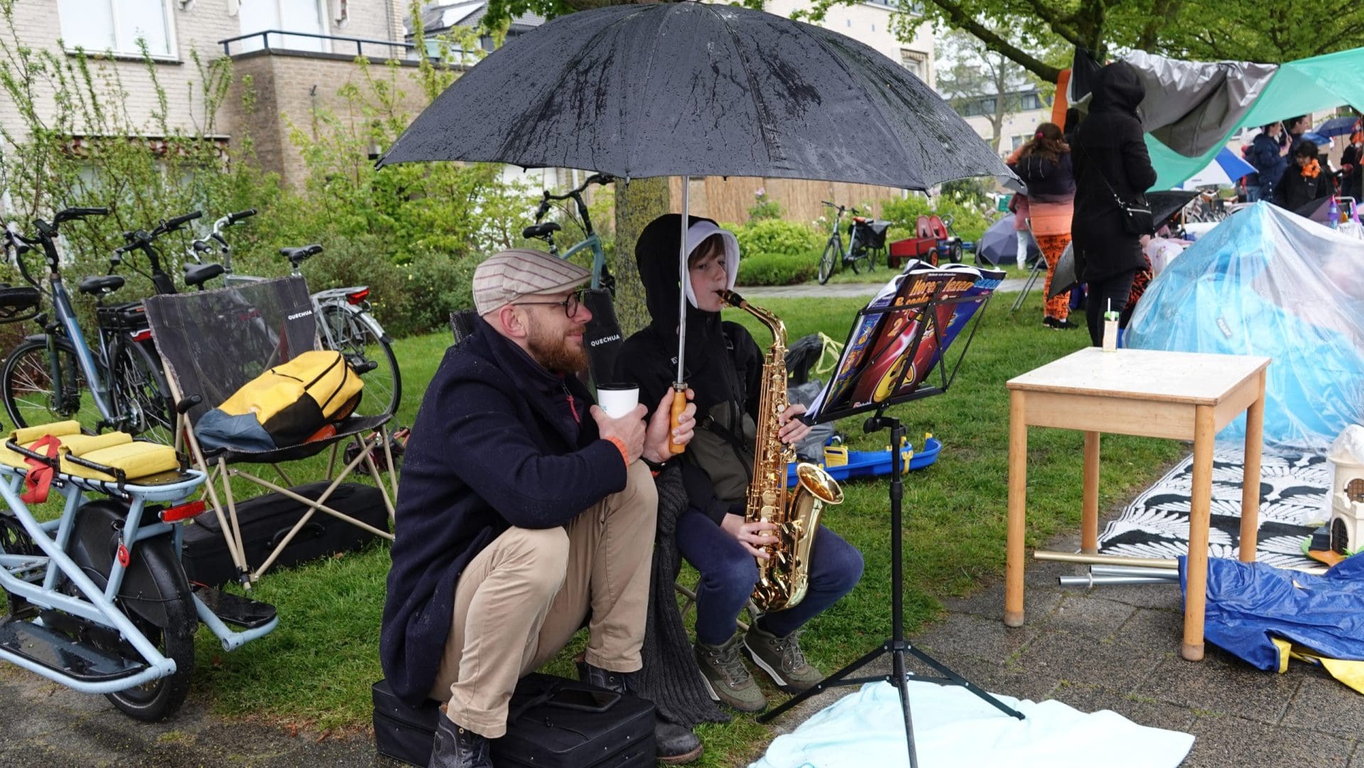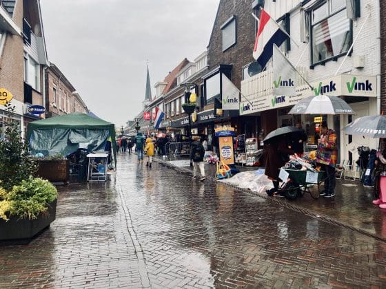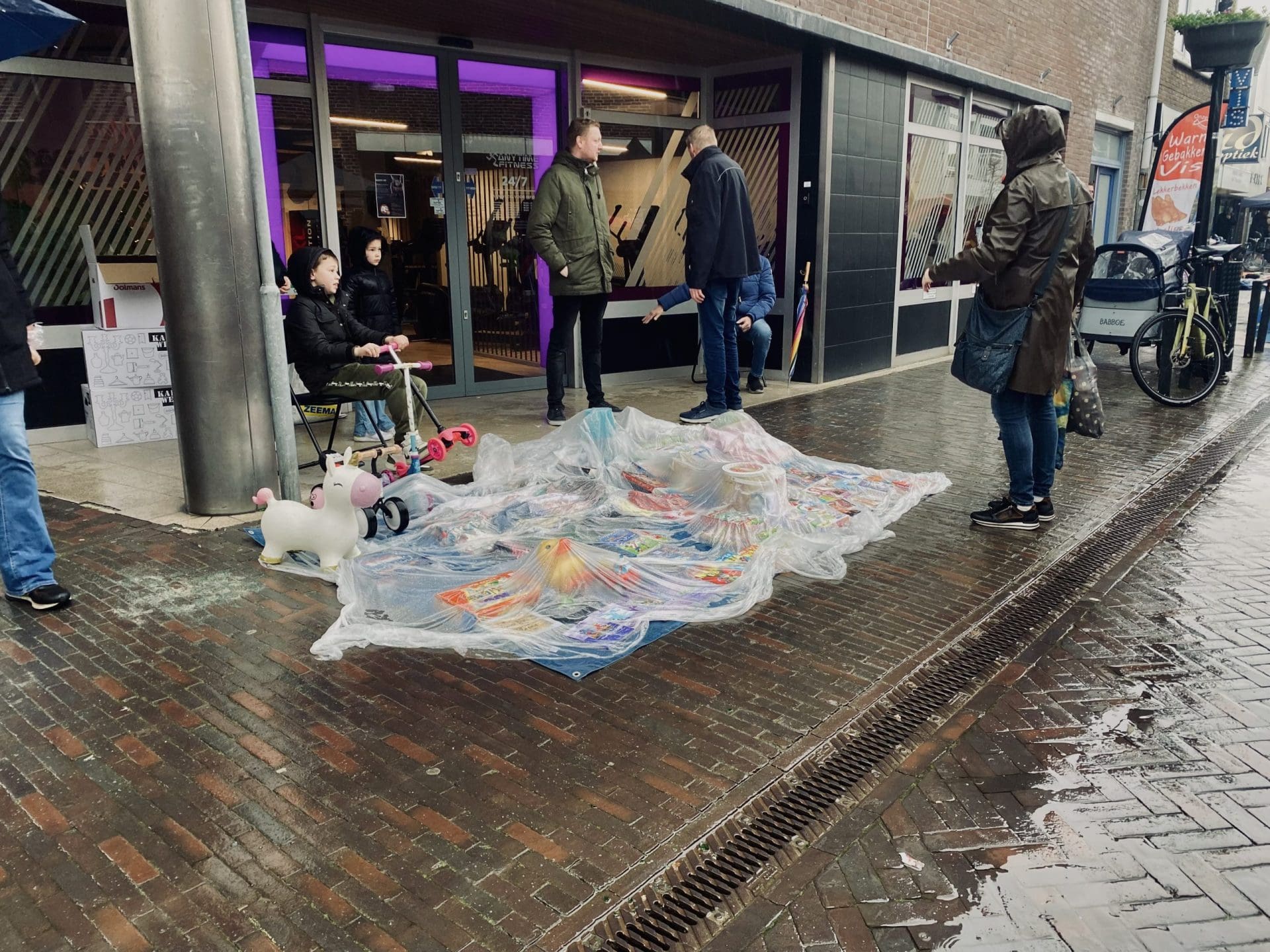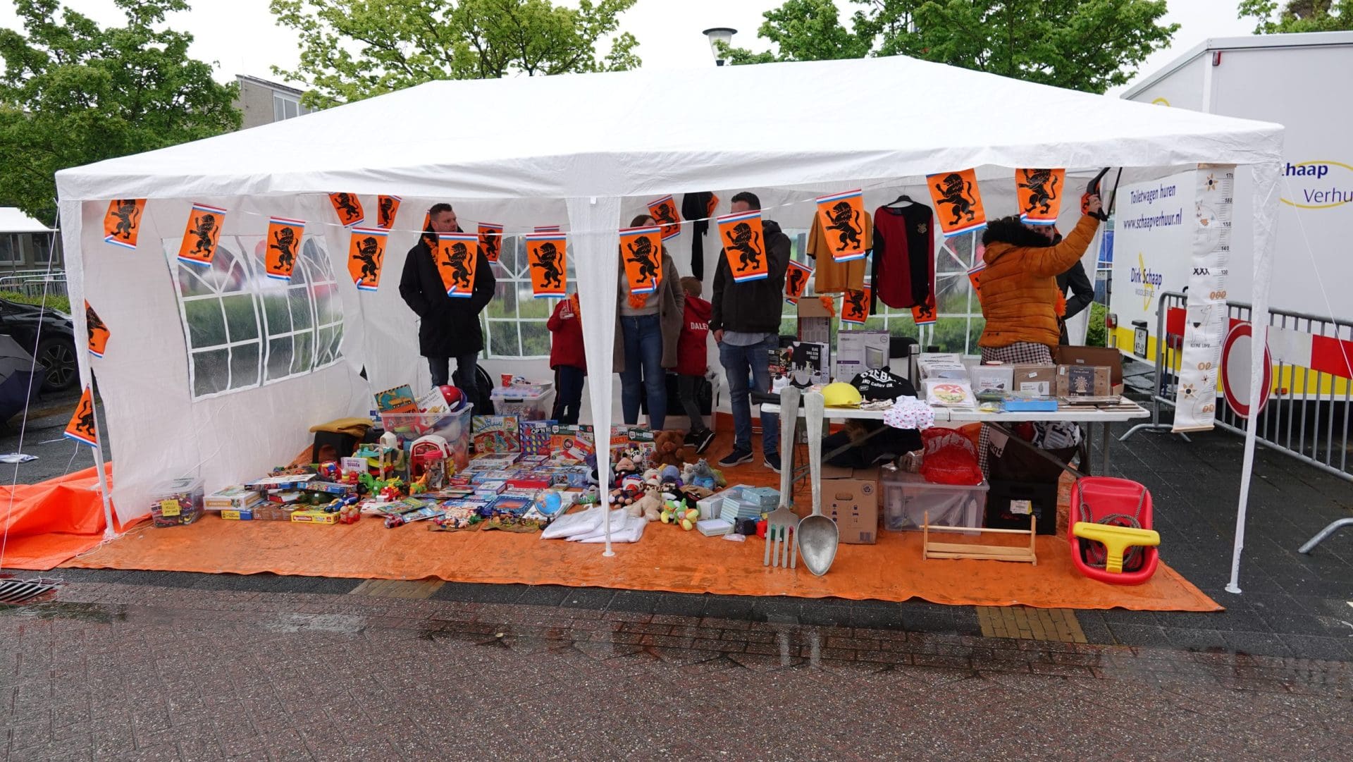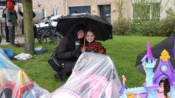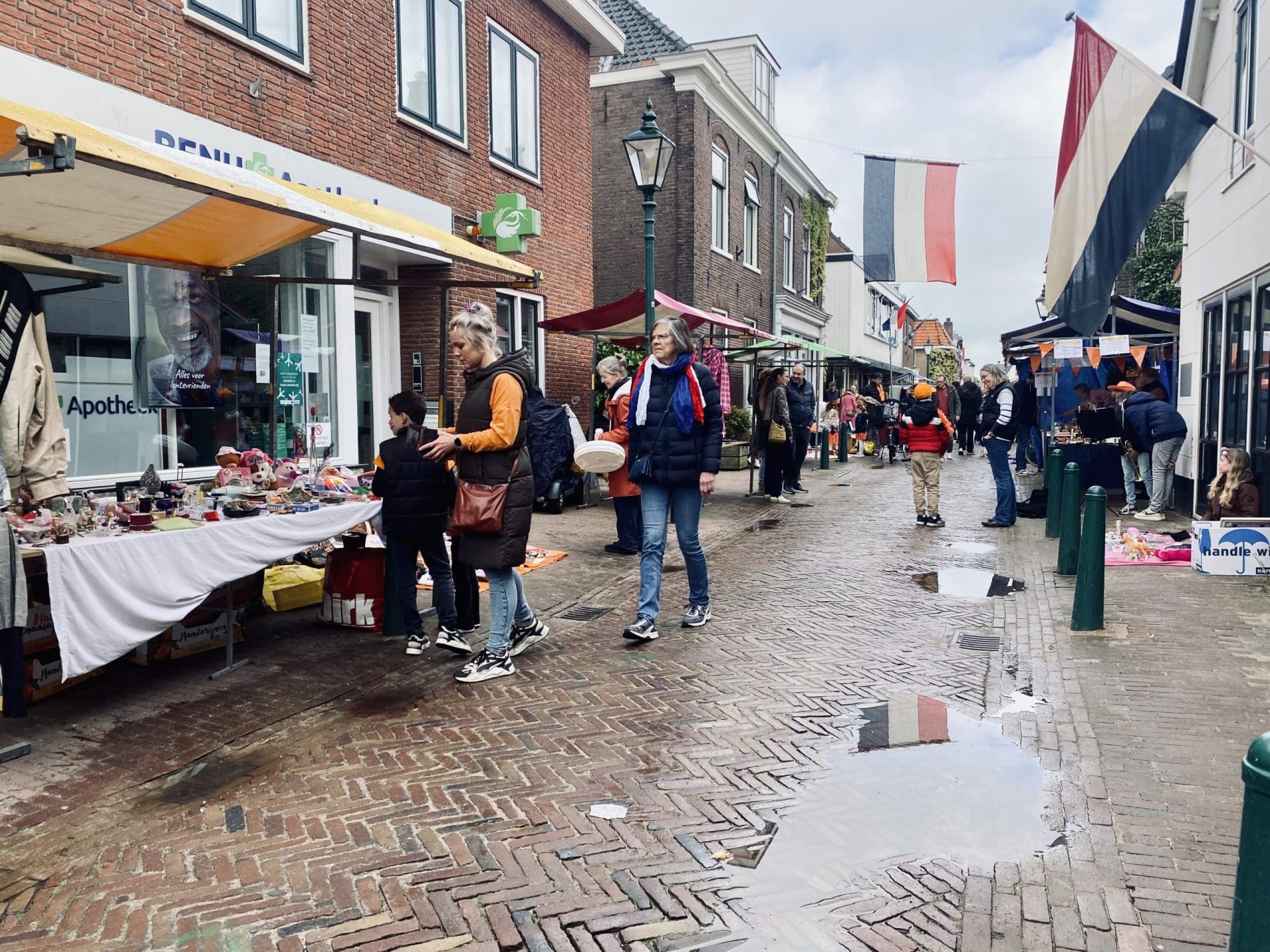Noordwijkerhout: Ook in Noordwijkerhout is het een natte boel. De normaal drukbezochte rommelmarkt lijkt, letterlijk, in het water te vallen. Toch staan de straten rond de Witte Kerk vol met voortvarende verkopers om hun oude spullen aan de man te brengen. Met geïmproviseerde oplossingen zorgen dat de producten zo goed als droog blijven.