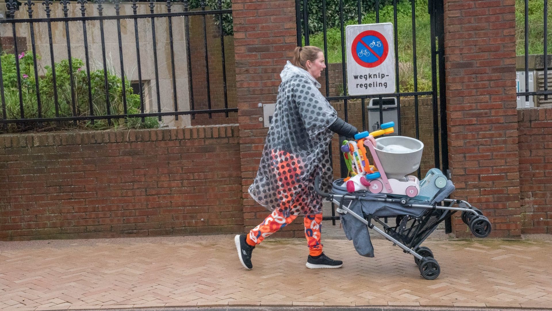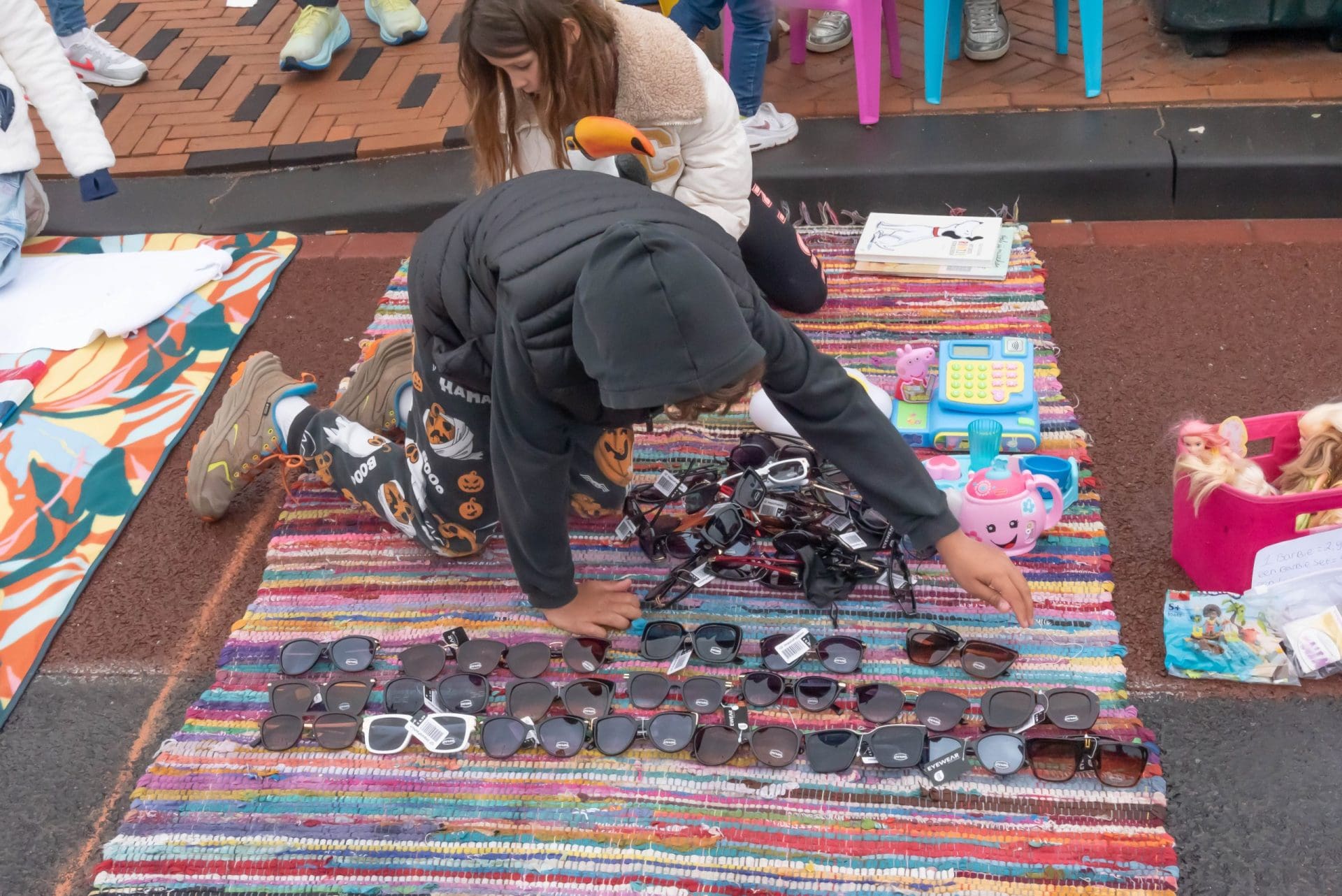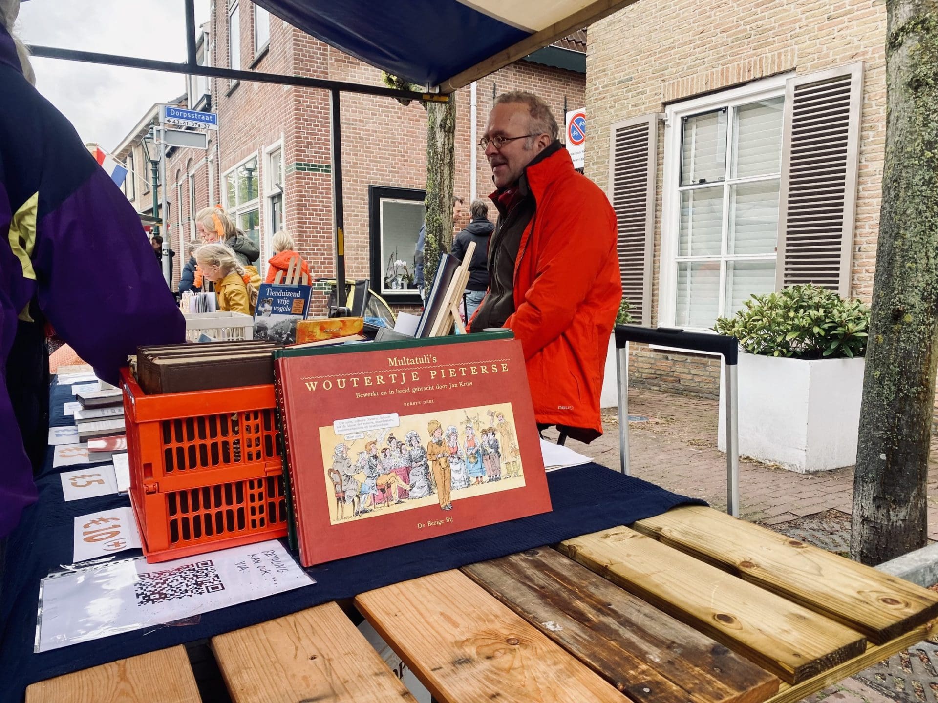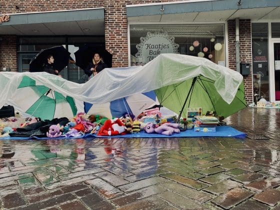Noordwijkerhout: Ook in Noordwijkerhout is het een natte boel. De normaal drukbezochte rommelmarkt lijkt, letterlijk, in het water te vallen. Toch staan de straten rond de Witte Kerk vol met voortvarende verkopers om hun oude spullen aan de man te brengen. Met geïmproviseerde oplossingen zorgen dat de producten zo goed als droog blijven.