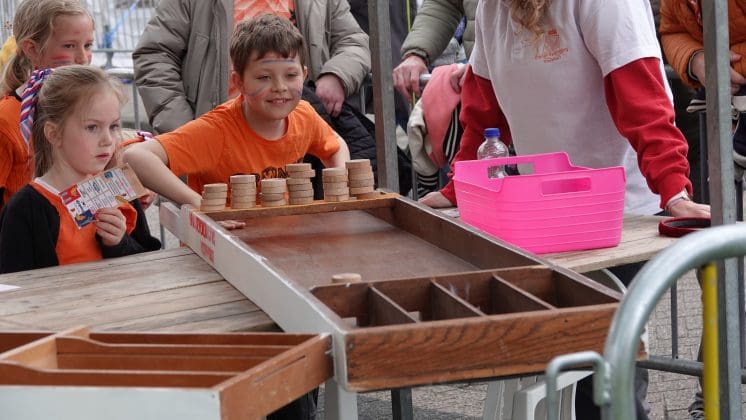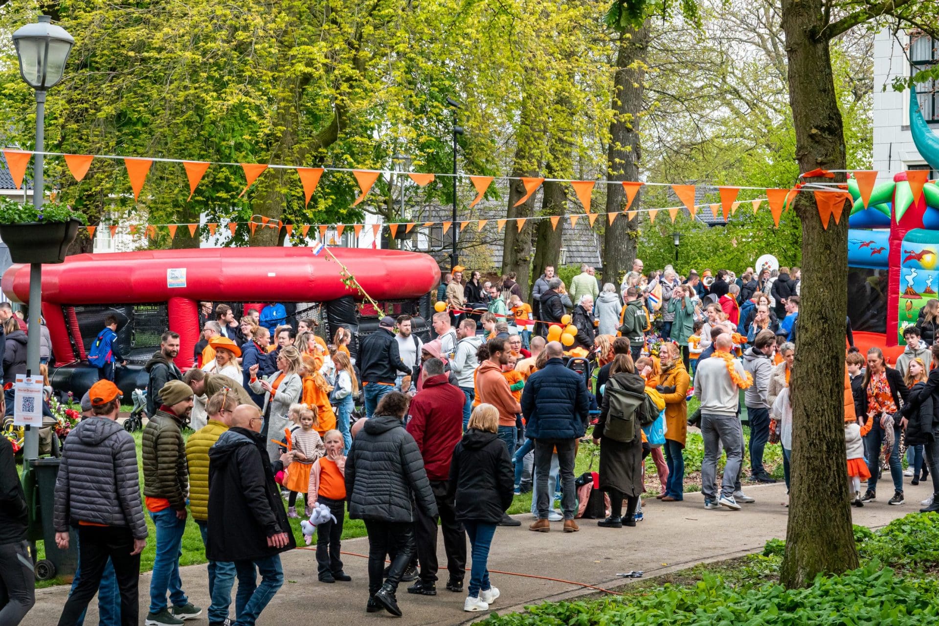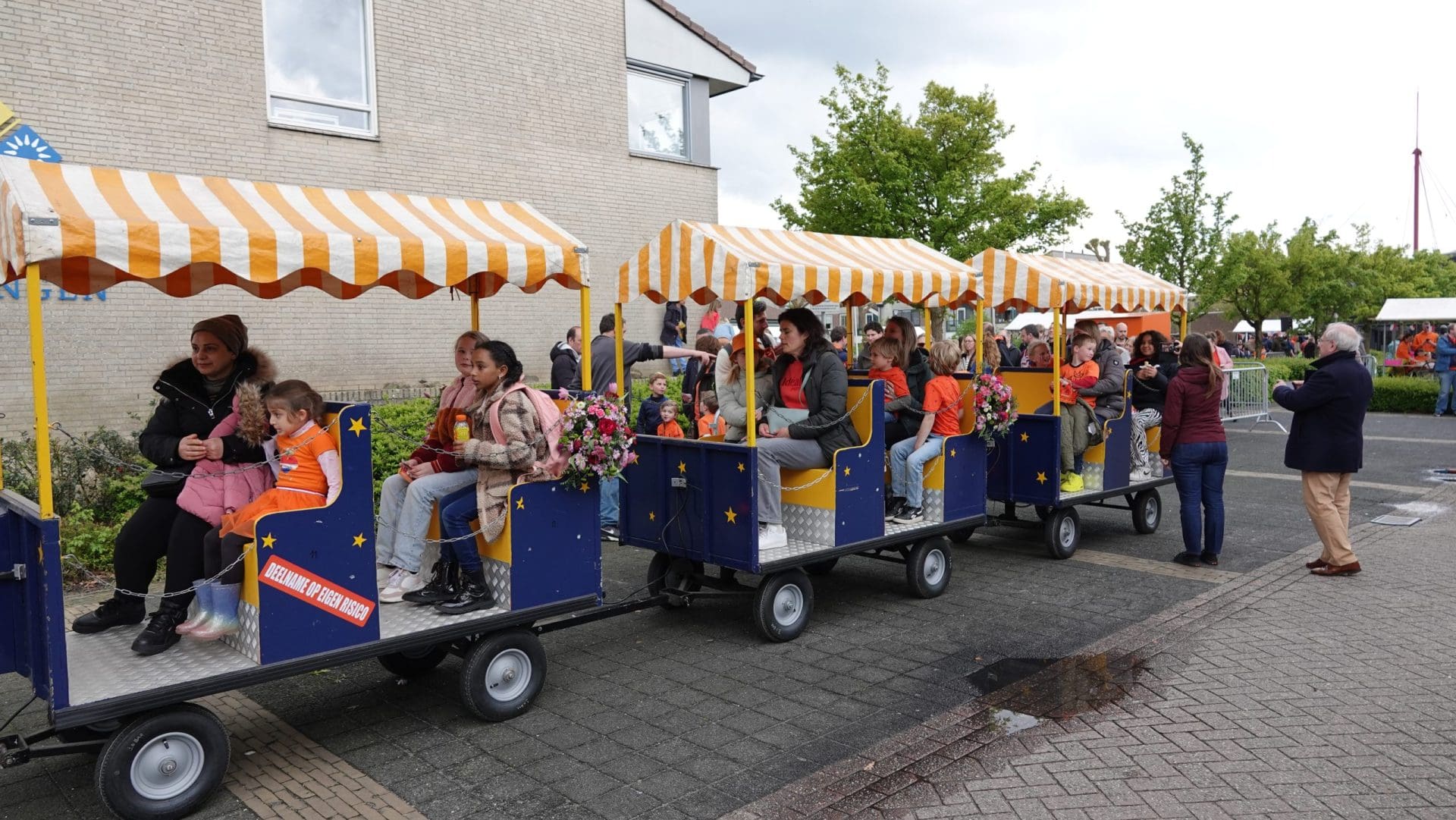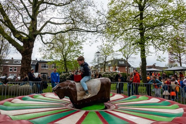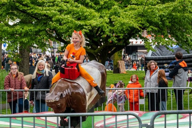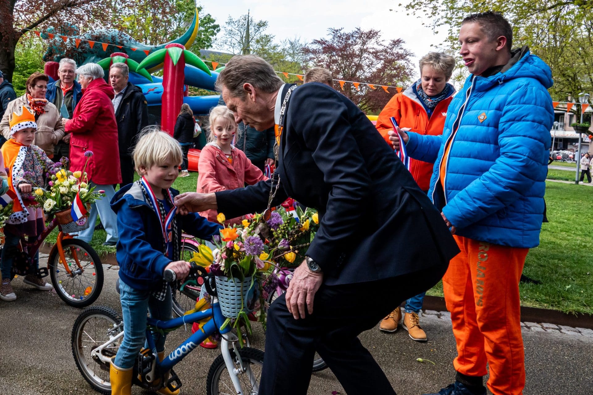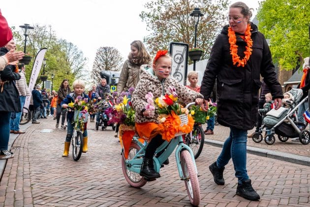 Hillegom: De leden van het Hillegomse oranjecomité stapten, net zoals hun collega’s uit omliggende dorpen, vroeg uit de veren. Het comité geeft ieder jaar een taart aan de vroege vogels die voor 09:00 de vlag aan de voorkant van het huis hangen. In het centrum is ondertussen de Hoftuin voor één dag omgetoverd in een speelparadijs voor kinderen: het voetbalveld, de rodeo-stier en de stormbaan zijn echte trekpleisters. Burgemeester Arie van Erk reikt tijdens het kinderbloemencorso de medailles uit aan de meest kleurrijke fietsen van de kleintjes.