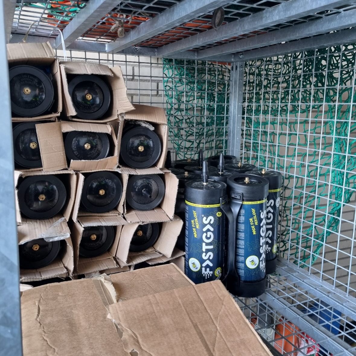 Na de vondst werden twee personen aangehouden; de lachgascilinders werden in beslag genomen.