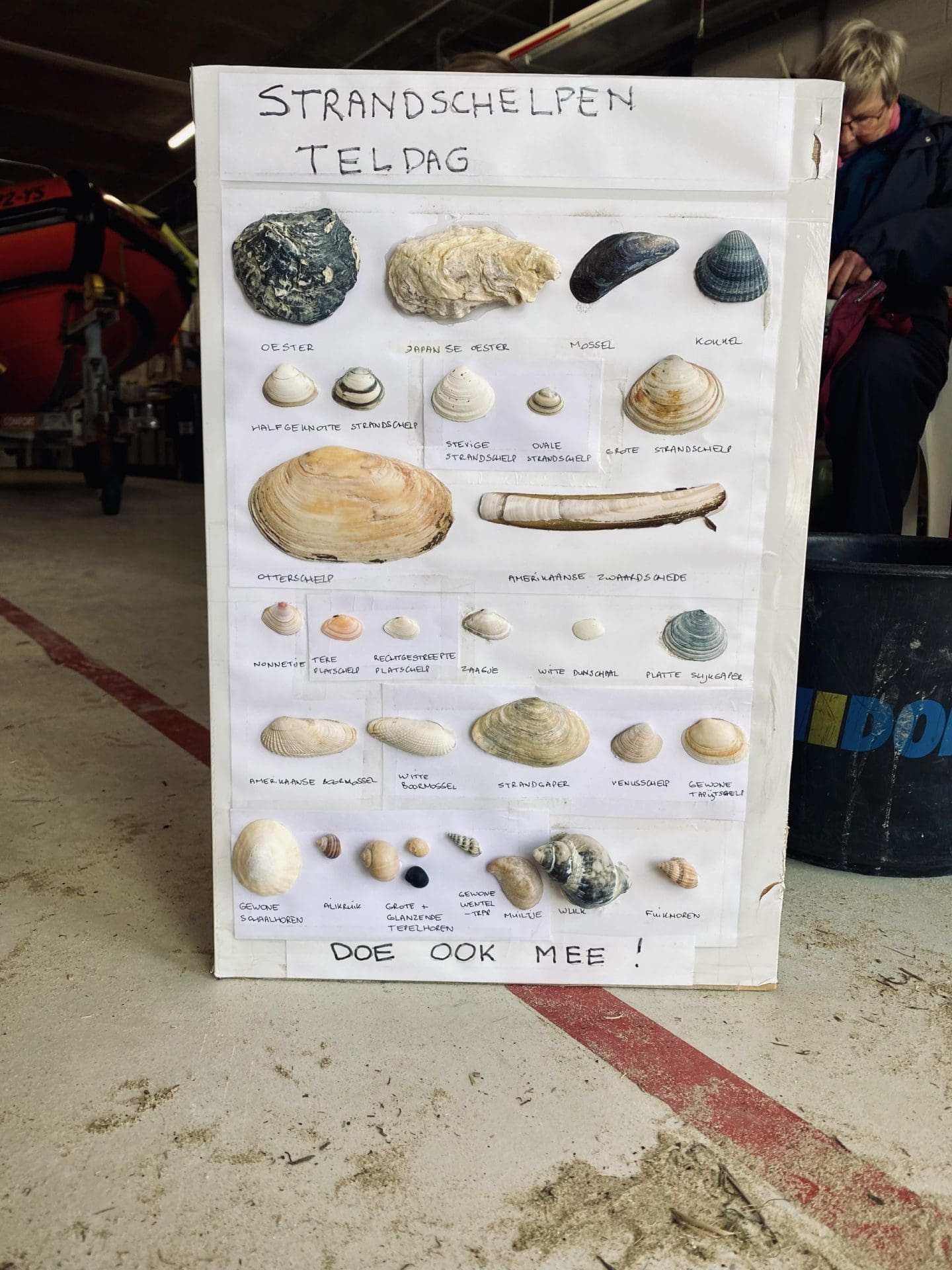 ‘Jammer dat er vandaag geen oostenwind is’, zegt een van de vrijwilligers. ‘Dat is veel leuker voor de schelpenzoekers.’ De onderstroom neemt dan namelijk de meest diverse schelpen met zich mee. Door de stevige zuidwestelijke wind worden vandaag vooral de grijs geribbelde kokkels en ovale strandschelpen door de zee aan wal gelegd. De windvlagen van 55 kilometer per uur zorgen niet alleen voor een minder grote diversiteit aan schelpen, ook de opkomst van de vrijwillige schelpentellers blijft nog achter. Toch is een tiental enthousiastelingen druk bezig met het onderscheiden van de verschillende schelpen. Een taak die nog niet zo makkelijk blijkt te zijn.