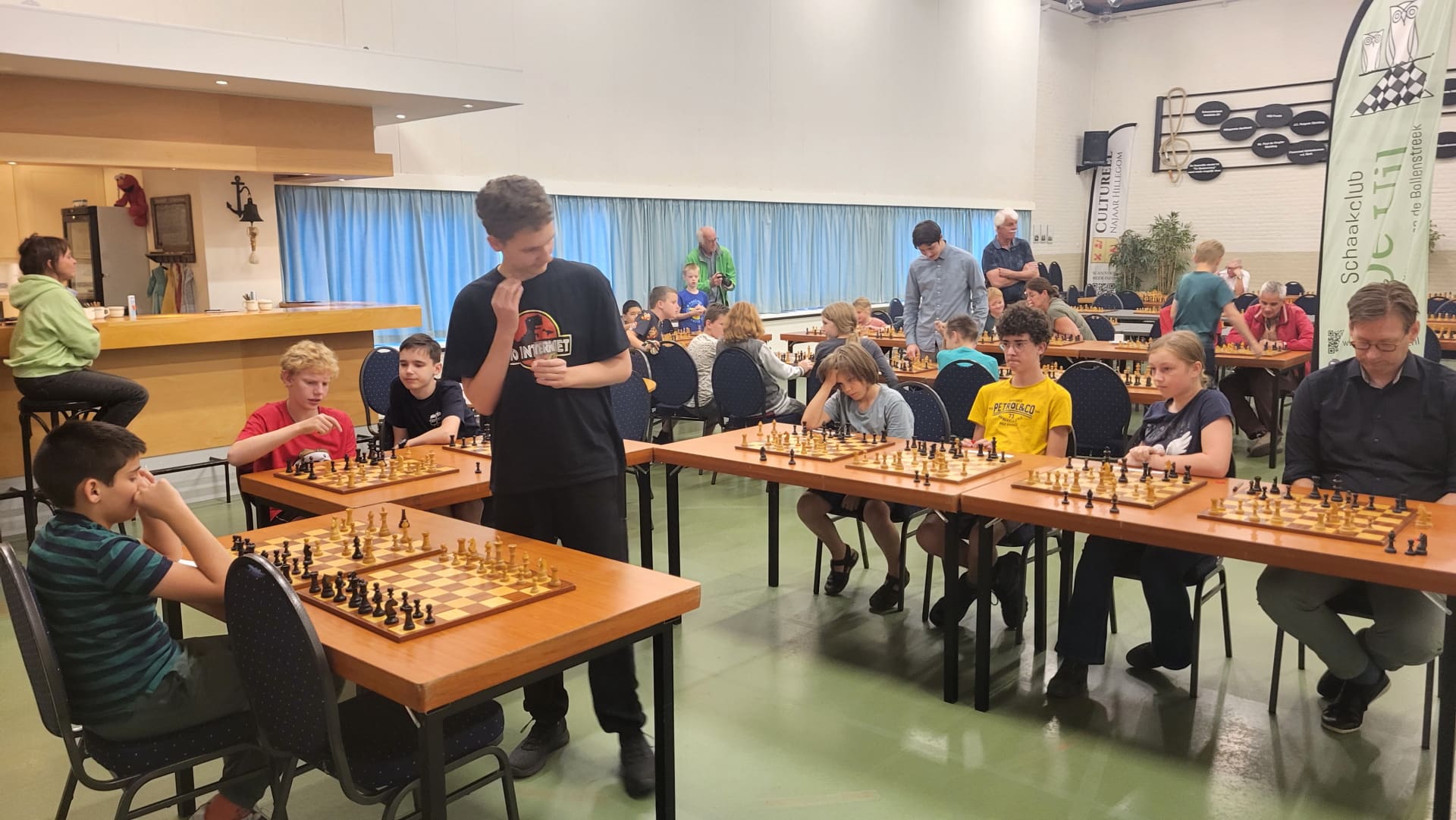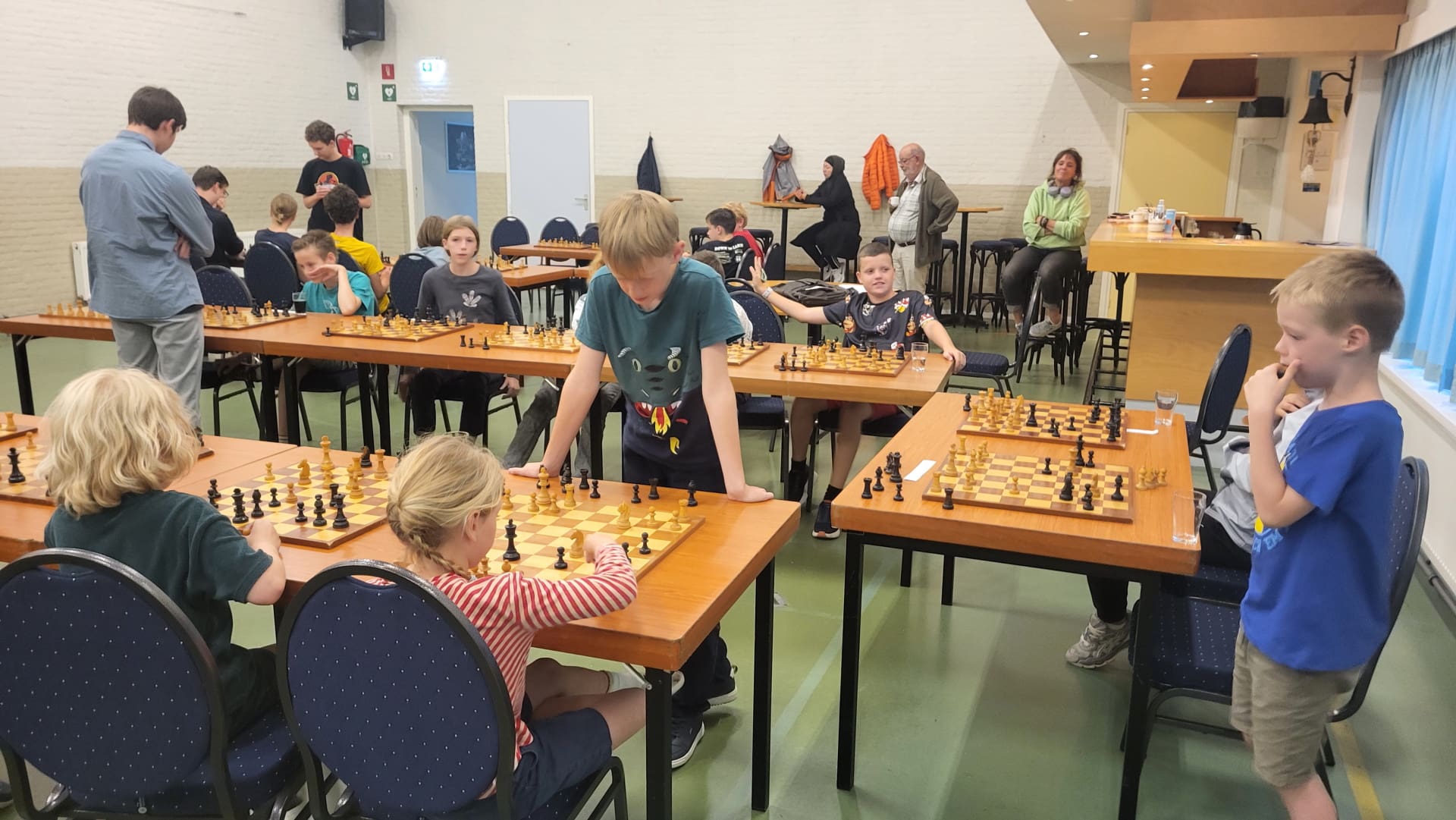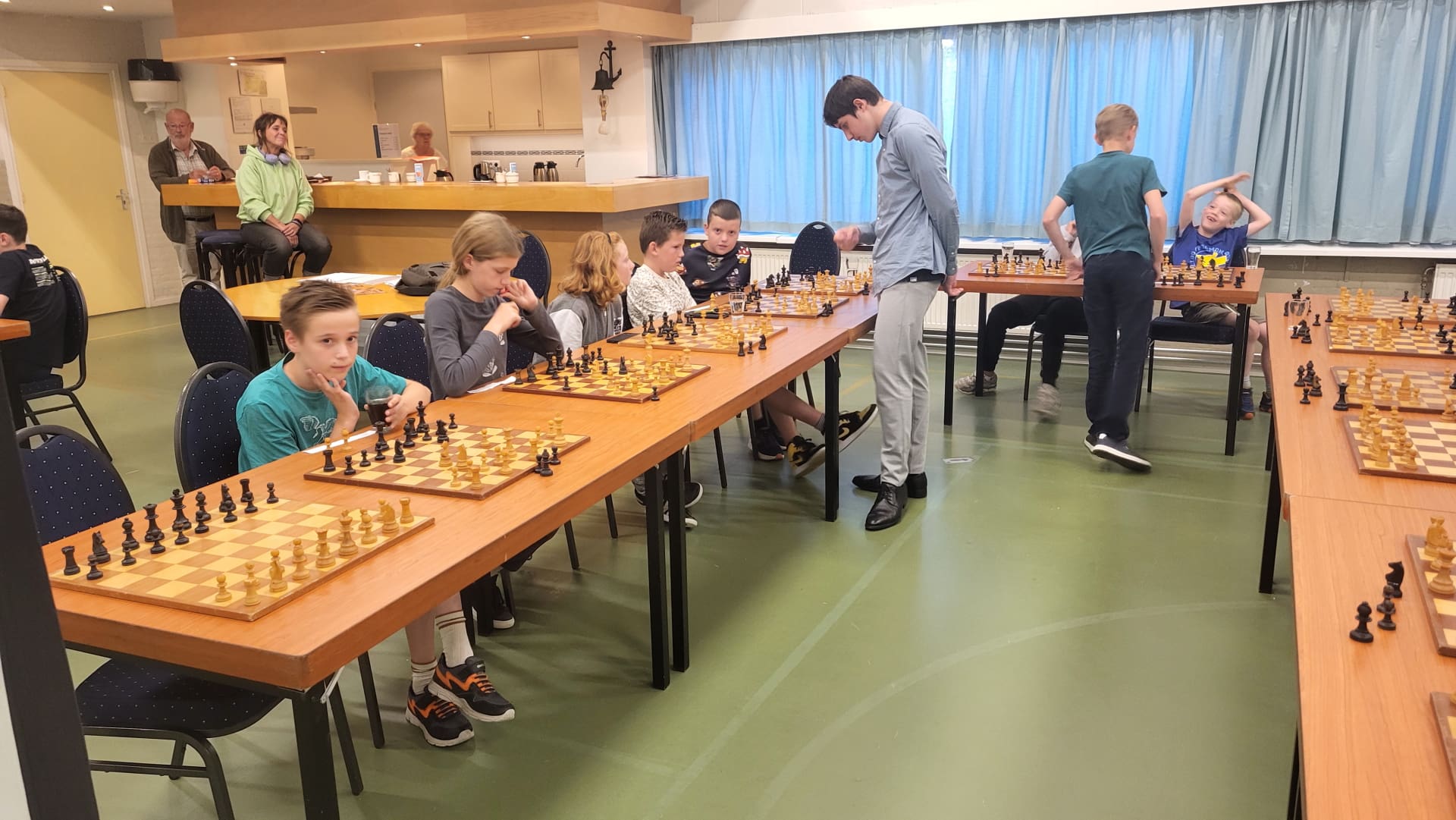 Bij een dergelijke wedstrijd spelen individuele schakers tegen meerdere tegenstanders. De drie hoogst geplaatste spelers uit de jeugdcompetitie traden op als simultaangevers en namen het gezamenlijk op tegen twintig tegenstanders. Stijn speelde tegen de oudere jeugd en won al zijn acht partijen. Jacob werd uitgedaagd door de jongste deelnemers en behaalde 4,5 punt uit zes partijen. Moanes bleef ongeslagen in zijn zes partijen tegen kinderen tot 12 jaar.