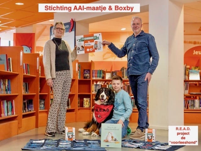 Noordwijk – Stichting AAI-maatje heeft tijdens de nationale voorleesdagen een donatie van 2.750 euro ontvangen van Scholtus, een fabrikant van voer voor huisdieren. De donatie is een blijk van waardering voor de succesvolle verkoop van de Boxby Lettergame, een interactief spel waarbij kinderen hun leesvaardigheid kunnen verbeteren door middel van hondenkoekjes in de vorm van letters. De cheque is overhandigd in bibliotheek Noordwijk.