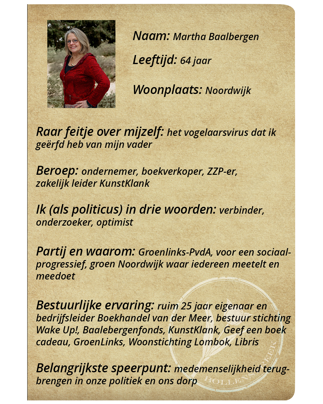 “De afgelopen jaren ben ik als inwoner van Noordwijk steeds vaker betrokken geraakt bij gesprekken naar aanleiding van concrete gemeentelijke plannen en besluiten. Wat mij daarbij opviel, is dat veel mensen wel vragen of zorgen hebben, maar het niet altijd eenvoudig vinden om die in een politieke of bestuurlijke context te plaatsen. Dat kost tijd en vraagt om uitleg.