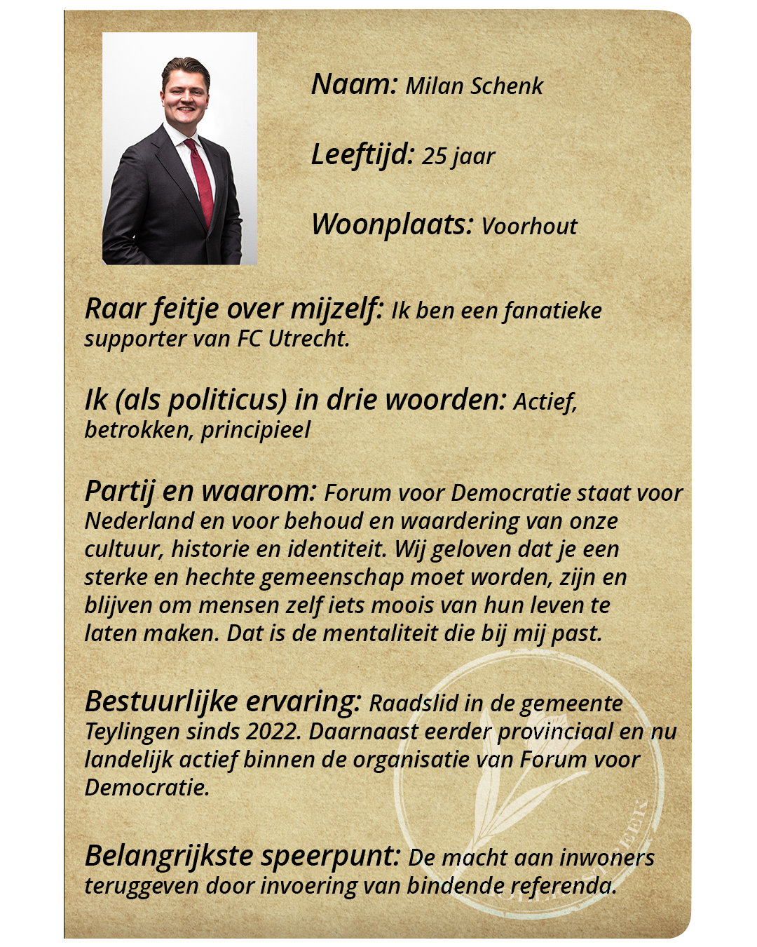 De afgelopen raadsperiode heeft Forum voor Democratie Teylingen een belangrijke en zichtbare rol gespeeld. Absolute hoogtepunt was het stoppen van de plannen voor een asielzoekerscentrum in Voorhout. Door stevige oppositie zijn zorgen over veiligheid, leefbaarheid en draagvlak zo duidelijk naar voren gekomen dat het plan uiteindelijk strandde.