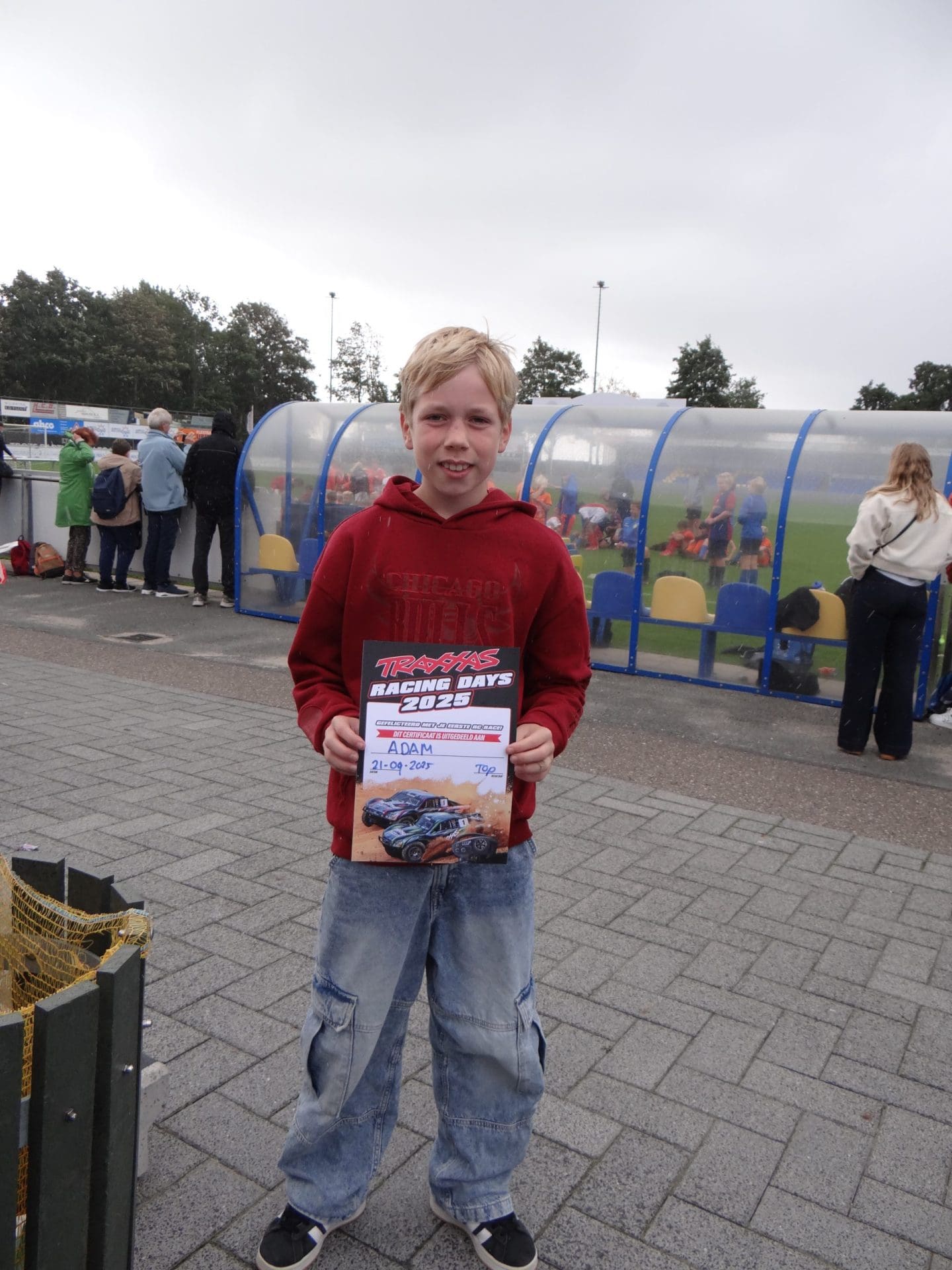 Terwijl de drie kinderen fanatiek aan het racen zijn, schiet er een autootje onder de barrière van de baan. De schoonzoon, die als supervisor fungeert en de boel goed in de gaten houdt, tilt de barrière met zijn voet omhoog en het autootje vervolgt zijn weg. Na ongeveer vijftien minuten zijn de drie klaar met racen en sprinten vervolgens naar het naastgelegen voetbalveld voor de prijsuitreiking van het voetbaltoernooi. “Niet zo snel, je moet je veters goed strikken anders val je,” zegt een moeder tegen haar kind, dat net klaar is met racen. Zijn naam is Adam (10) en hij is vanuit Nieuw-Vennep naar de feestweek in Lisse gekomen. “Thuis knutsel ik ook met autootjes en dan vind ik het leuk om rondjes te rijden in de huiskamer of aan races mee te doen. Ik kom speciaal voor het rijden met deze radiografische autootjes en ik weet nog niet of ik aan andere sporten ga meedoen,” zegt hij, terwijl hij trots zijn certificaat laat zien dat hij heeft gekregen.