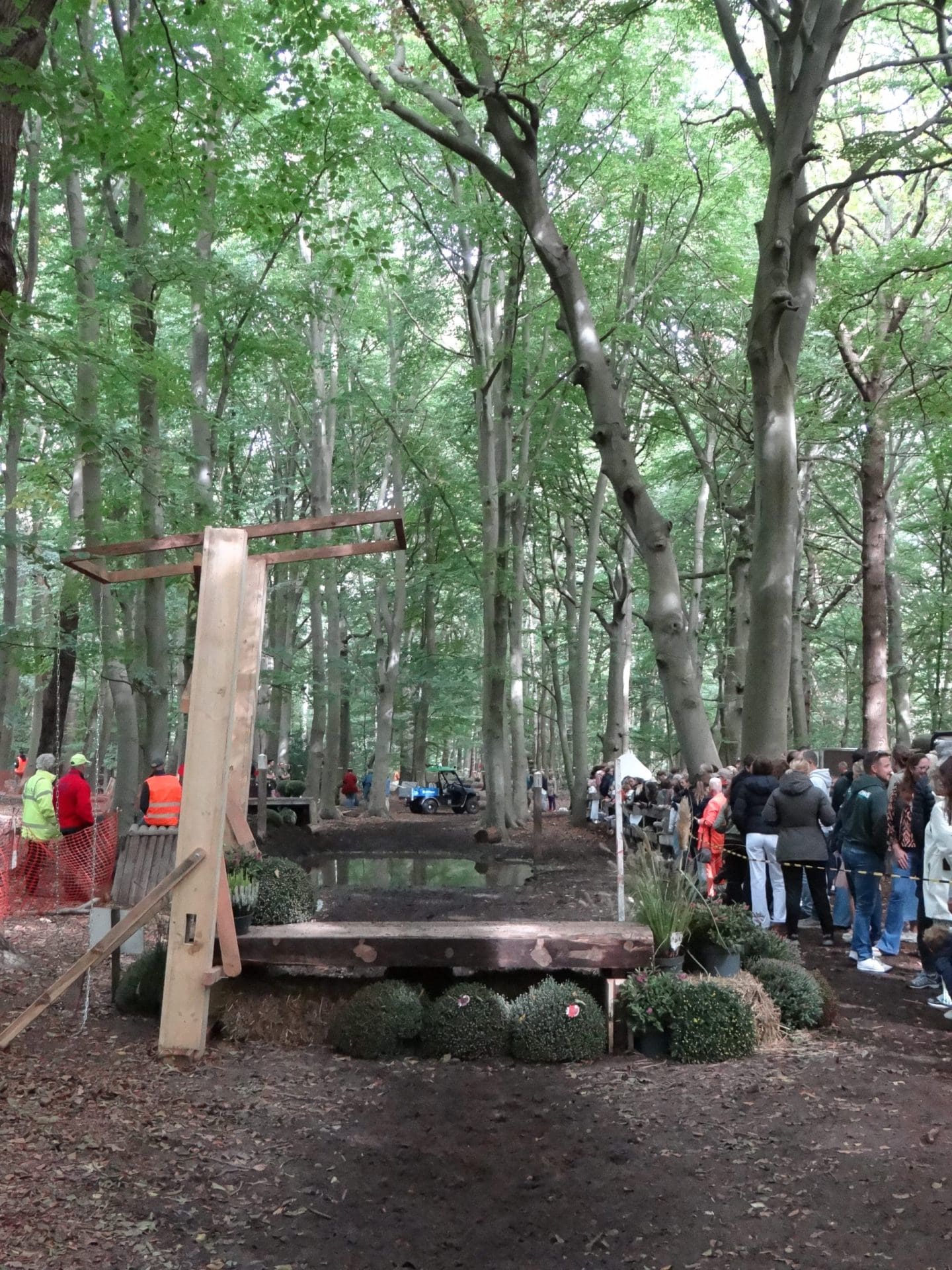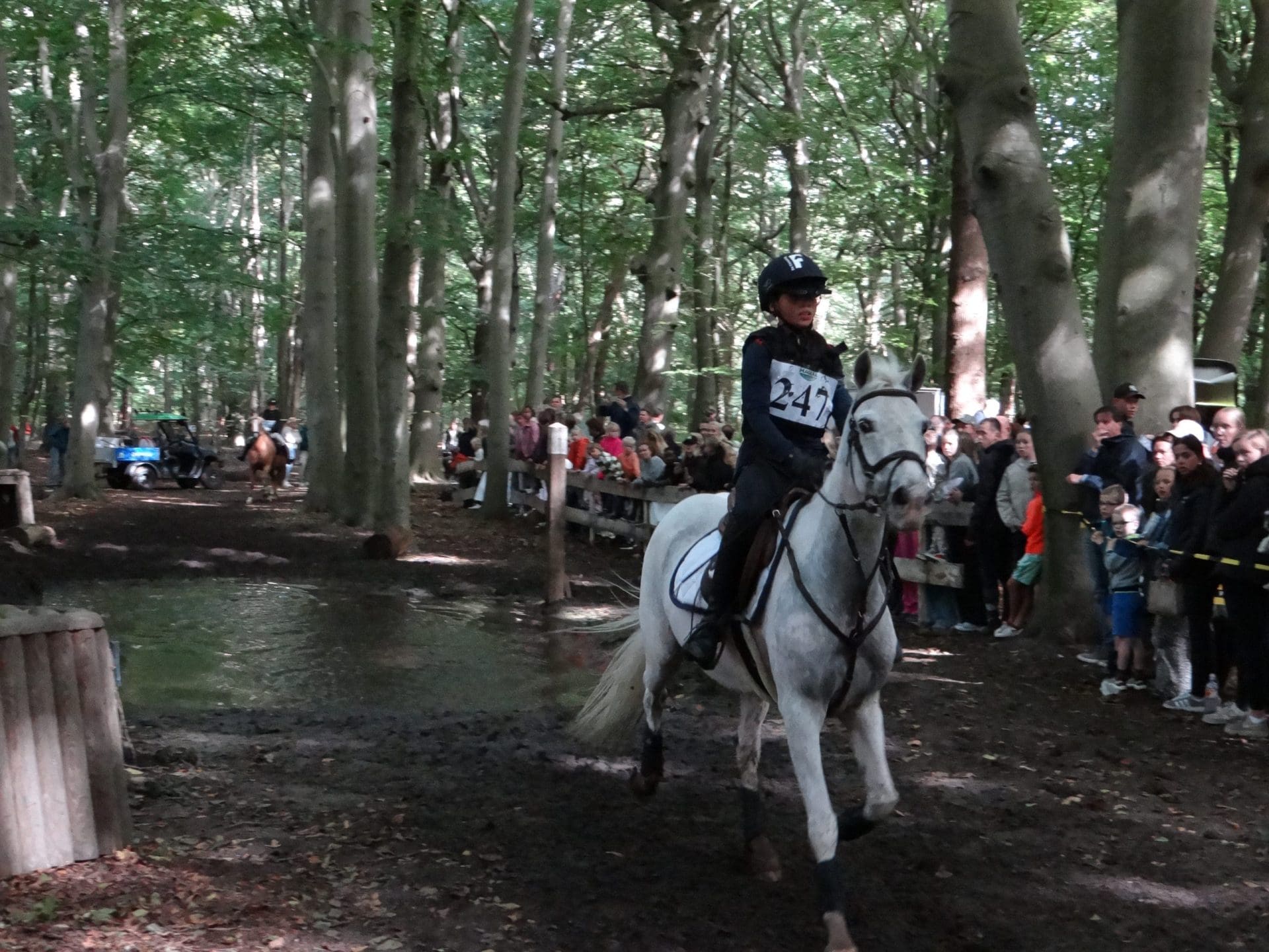 In de middag nadert het evenement bij de paardenwedstrijd zijn einde en het is wel duidelijk voor welke hindernis het aanwezige publiek gekomen is: de waterbak. Dat dit onderdeel bij eventing bij de paarden niet altijd geliefd is, blijkt wel als er bij drie deelnemers het dier plotseling afremt en met angst en beven stil blijft staan om natte voeten te halen. Terwijl de berijdsters op allerlei manieren proberen het dier door het water te sturen, blijkt dat sommigen proberen óf erlangs te lopen óf heel langzaam eerst te voelen of het water koud is. “Dit blijft toch één van de meest gevreesde onderdelen bij eventing, zelfs ervaren ruiters en paarden kijken hier toch met angst en beven naar. Dan is het voor de deelnemer of deelneemster toch mooi als onder luid applaus het dier toch door de hindernis durft te gaan,” zegt Mark van der Sloot.