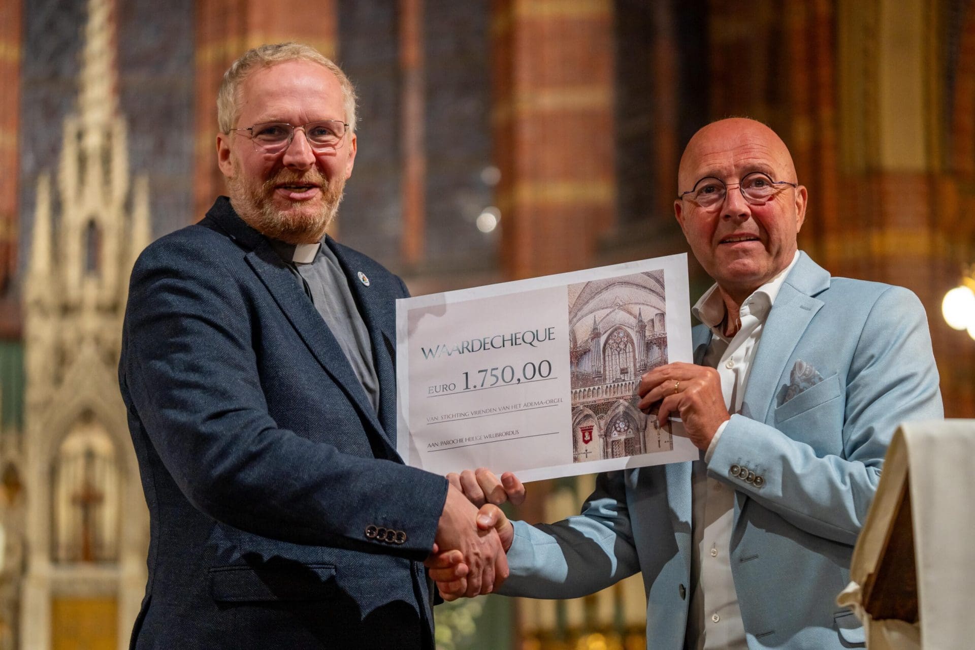 Pastoor Bosma (l) ontvangt de cheque van voorzitter van Vrienden van het Ademaorgel Frank Mélotte (foto: Vrienden van het Ademaorgel).