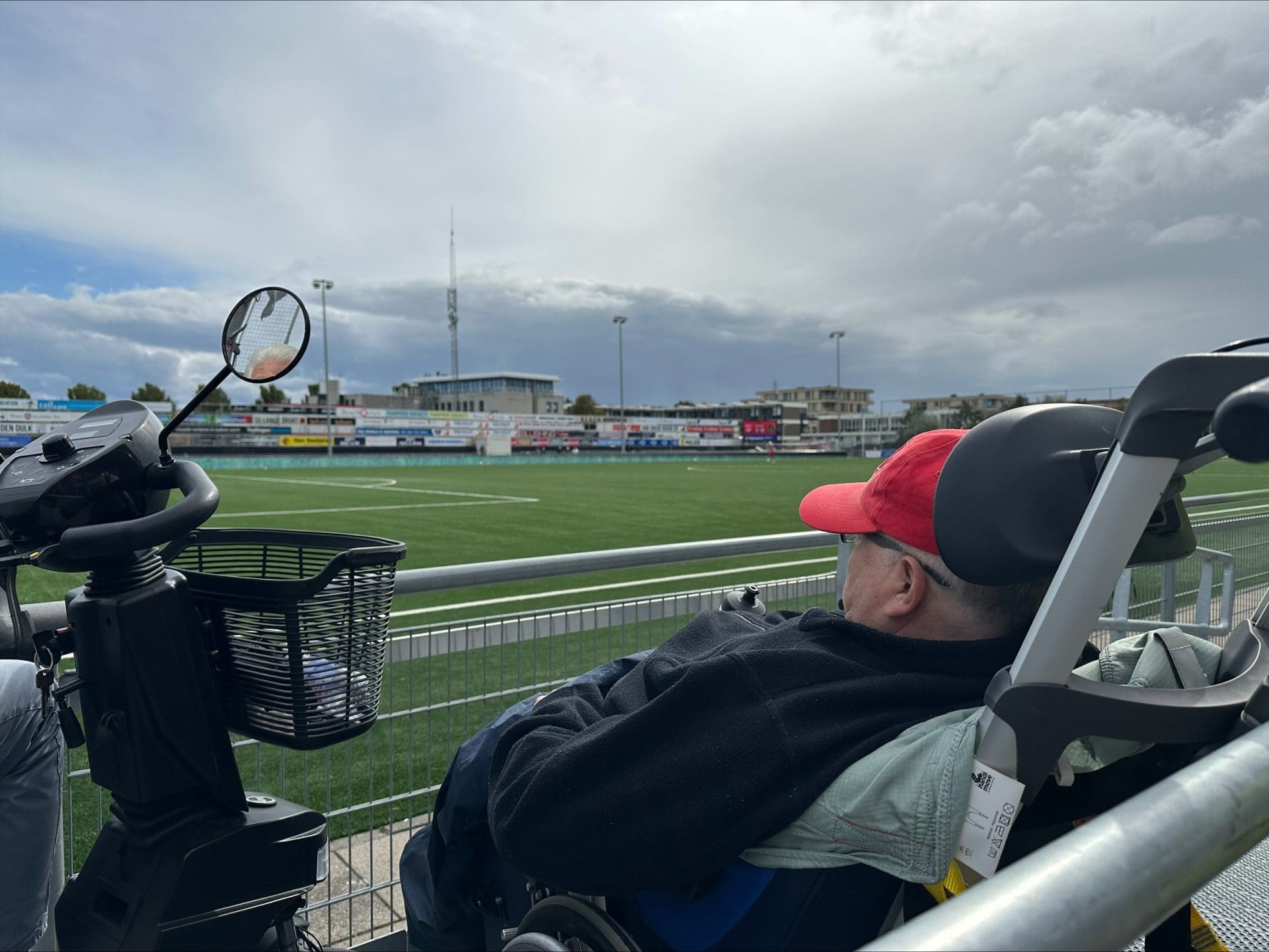 Voorheen zaten de rolstoelgebruikers helemaal bovenin op de tribune, waar het vaak te druk was om vrij te kunnen bewegen. Daarna zaten de mensen juist op het veld. Dat was ook niet in iedere situatie optimaal, vertelt rolstoelgebruiker Richard van der Berg terwijl hij vanaf het bordes op het veld kijkt: “Op het veld was het eigenlijk te gevaarlijk. Soms kwamen we bijna in botsing met spelers of kregen we een bal naar ons hoofd.”