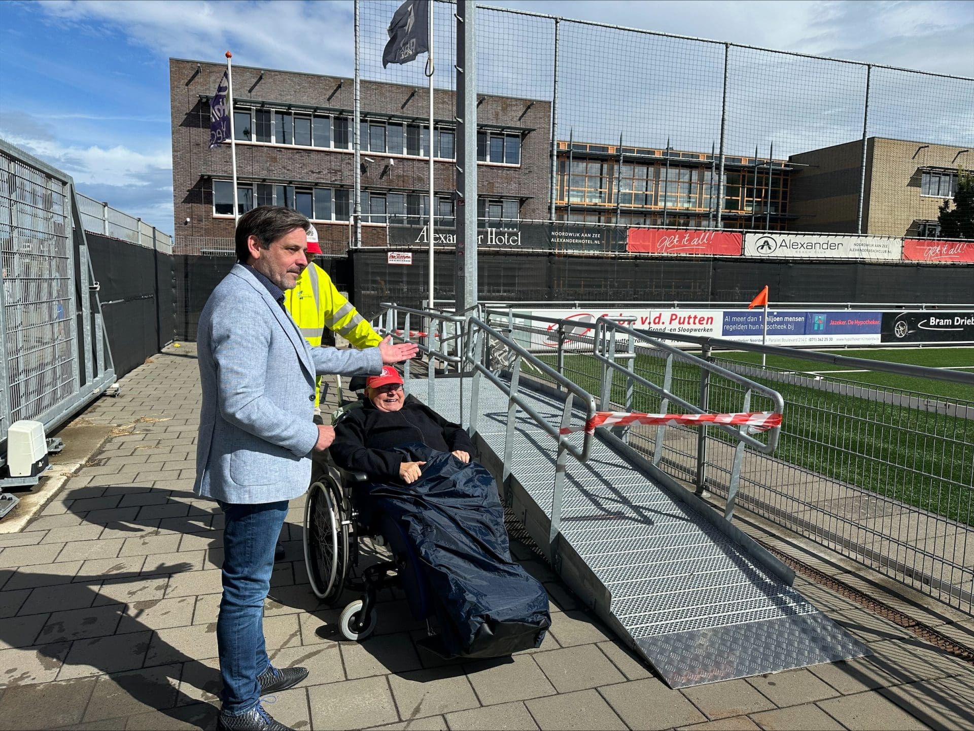 Noordwijk – Bij voetbalvereniging Noordwijk is zaterdagmiddag een speciaal rolstoelbordes geopend, waarop supporters in een rolstoel naar de wedstrijden van VV Noordwijk kunnen kijken. Wethouder van Welzijn, Sport en Volksgezondheid Dennis Salman verzorgde samen met de rolstoelgebruikers de opening, vlak voor de wedstrijd van Noordwijk tegen SV Meerssen.