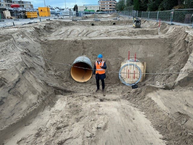Noordwijk – Twee indrukwekkende buizen steken in een diep gat uit de grond. Wethouder Theo Alkemade inspecteert een van de buizen die toegankelijk zijn gemaakt door het weg halen van houten veiligheidsschotten. Alkemade komt het werk aan het Wantveld bekijken en de uitleg voor alle aanwezigen komt van projectleider Peter Verhoef.